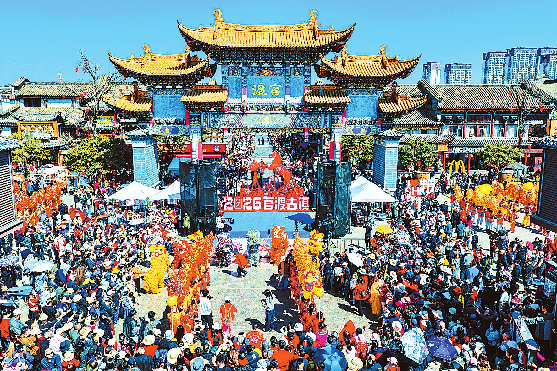 大年初一,昆明官渡古镇鼓乐齐鸣,游人如织。“滇味聚官渡·欢喜过大年”新春系列活动正式开启,一场“龙狮闹春”精彩上演,点燃了浓浓的“滇式”年味。从古镇大牌坊到金刚塔广场,处处高悬着红彤彤的灯笼。激昂的鼓点声中,鲁木纳龙狮艺术团的十条金色长龙与十头威武醒狮腾跃穿梭,赢得观众阵阵欢呼。与此同时,身着华美汉服的巡游队伍缓步于青砖黛瓦之间,尽显中华传统服饰的典雅韵味。节日期间,云南省文化馆的“大篷车”将继续开展惠民演出,九子方中医馆门前的小舞台也将轮番呈现汉服展示、古风乐演奏以及活力乐队表演。官渡古镇通过丰富多彩的民俗活动,让市民与游客沉浸式体验“有一种叫云南的生活”,度过一个别具风味的春节。本报记者 黄兴能 摄