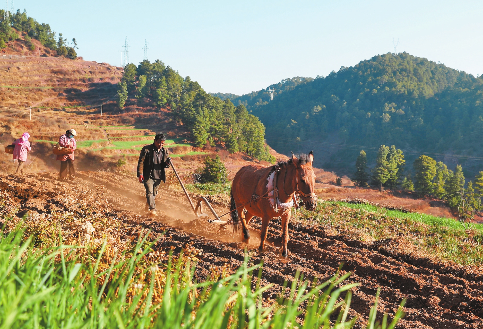 近日,禄劝彝族苗族自治县马鹿塘乡的农户陆续开展春耕备耕工作,整地施肥为春播做准备,田间地头一派繁忙景象。图为马鹿塘乡通龙村村民忙碌耕地。本报记者 黄兴能 摄