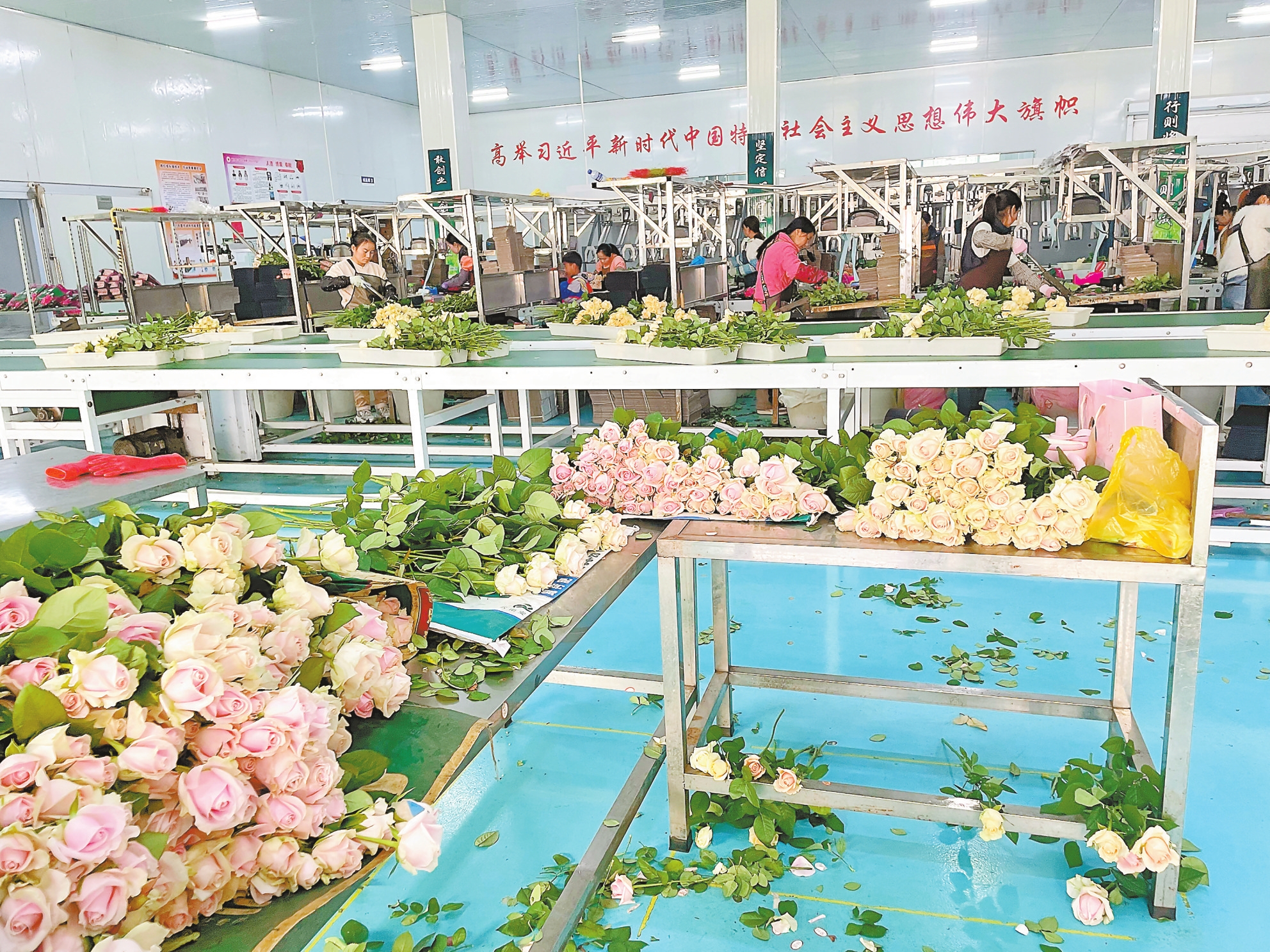 春节期间,姚安县花卉基地热火朝天,一垄垄月季在温棚里竞相绽放,粉红、正红、金黄交织成一片绚烂花海,空气中弥漫着沁人心脾的清香。花市热闹非凡,采花、分级、打包、装车,各道工序环环相扣,井然有序。
