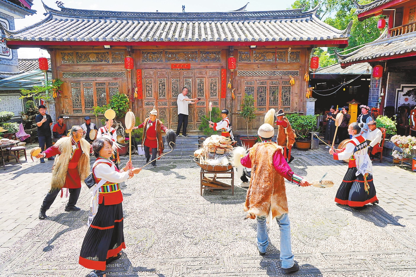 勒巴舞动作主要模仿动物形态和劳动场景,体现了纳西族与自然和谐相处的理念。勒巴鼓在舞蹈中扮演着举足轻重的角色,以其独特的音色和节奏,营造出庄重而热烈的氛围,为舞蹈增添了动感和韵律。2013年,纳西族勒巴舞被列入省级非物质文化遗产名录。