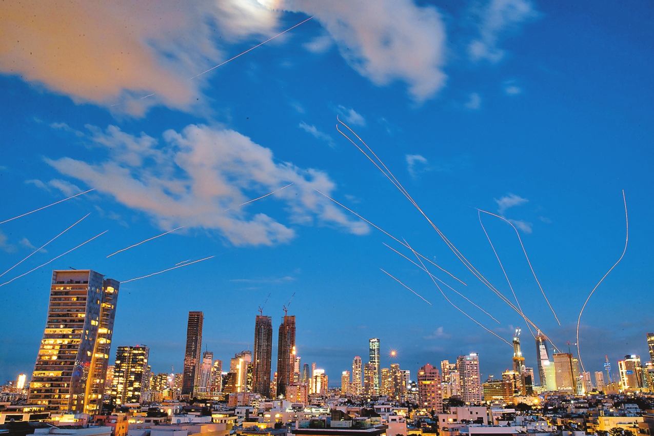 2月28日,在以色列特拉维夫,以军发射防空拦截弹(长时间曝光照片)。 新华社记者 陈君清 摄
