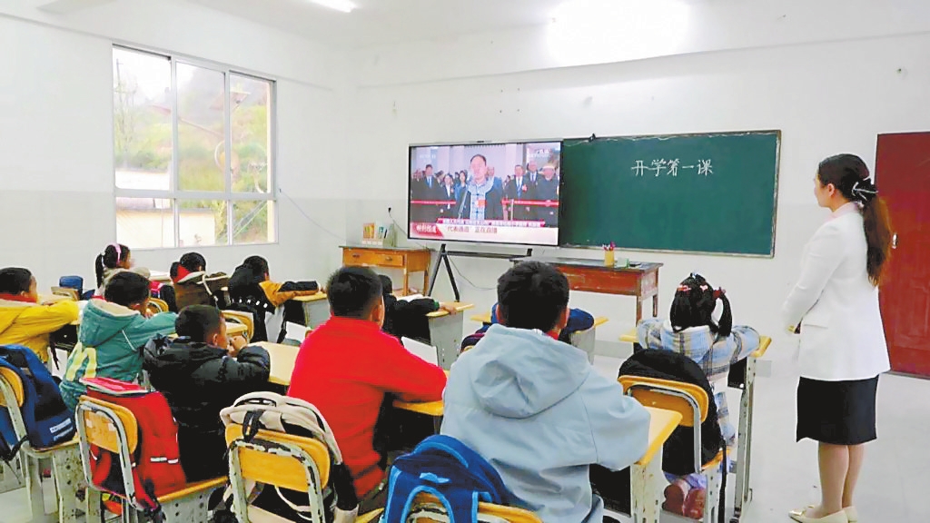 3月5日,新学期伊始,广南县落松地小学师生共同收看“代表通道”实况转播,通过屏幕,听农加贵老师讲自己的故事,上了一堂生动的思政课。