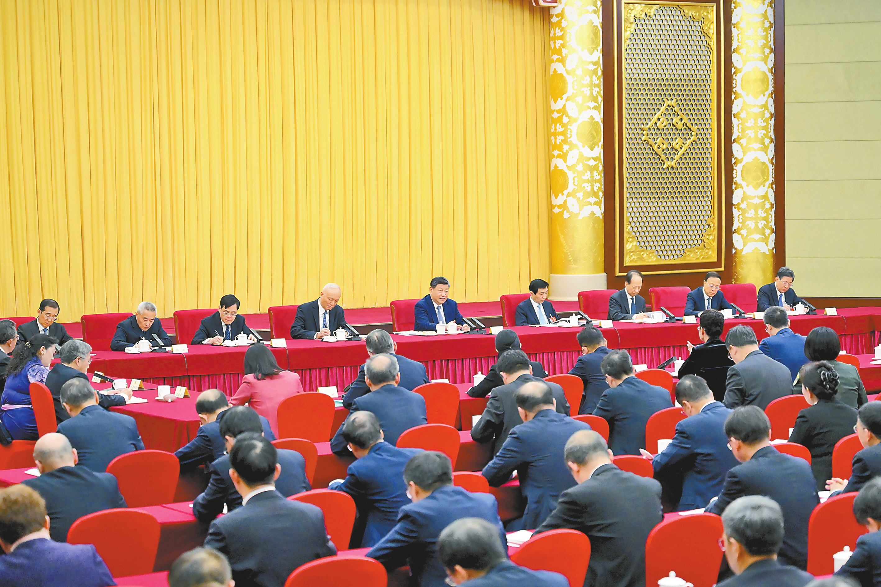 中共中央政治局常委、全国政协主席王沪宁,中共中央政治局常委、中央办公厅主任蔡奇参加看望和讨论。