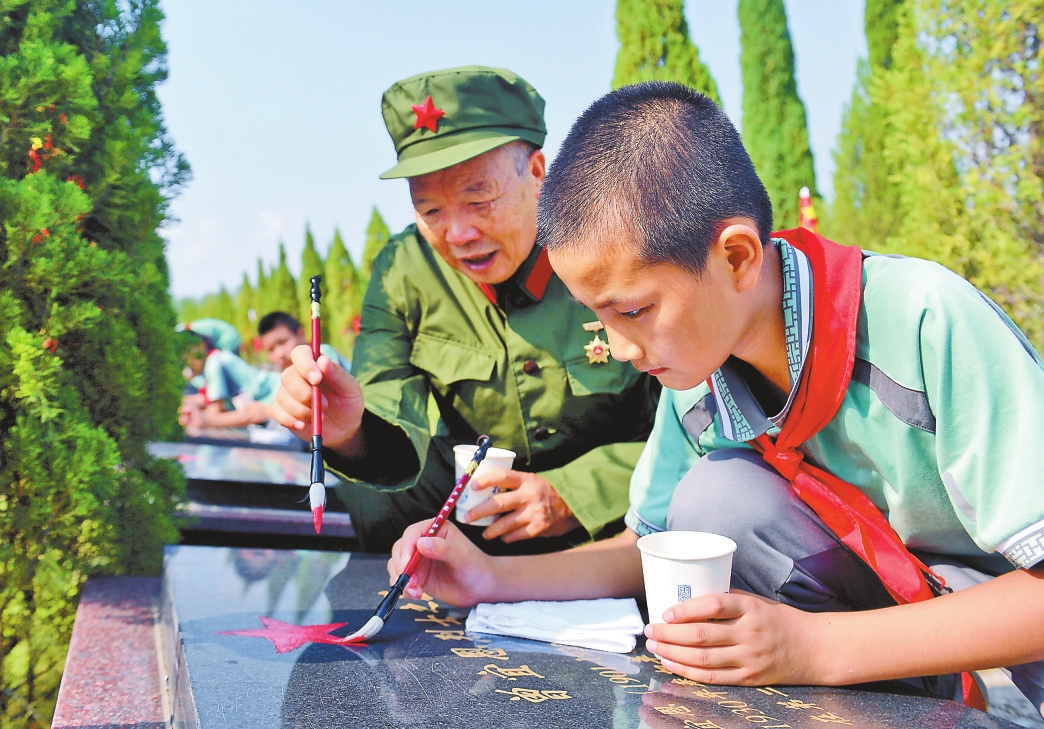 在于都县,老战士和少先队员为烈士墓碑描红。 刘小强 摄