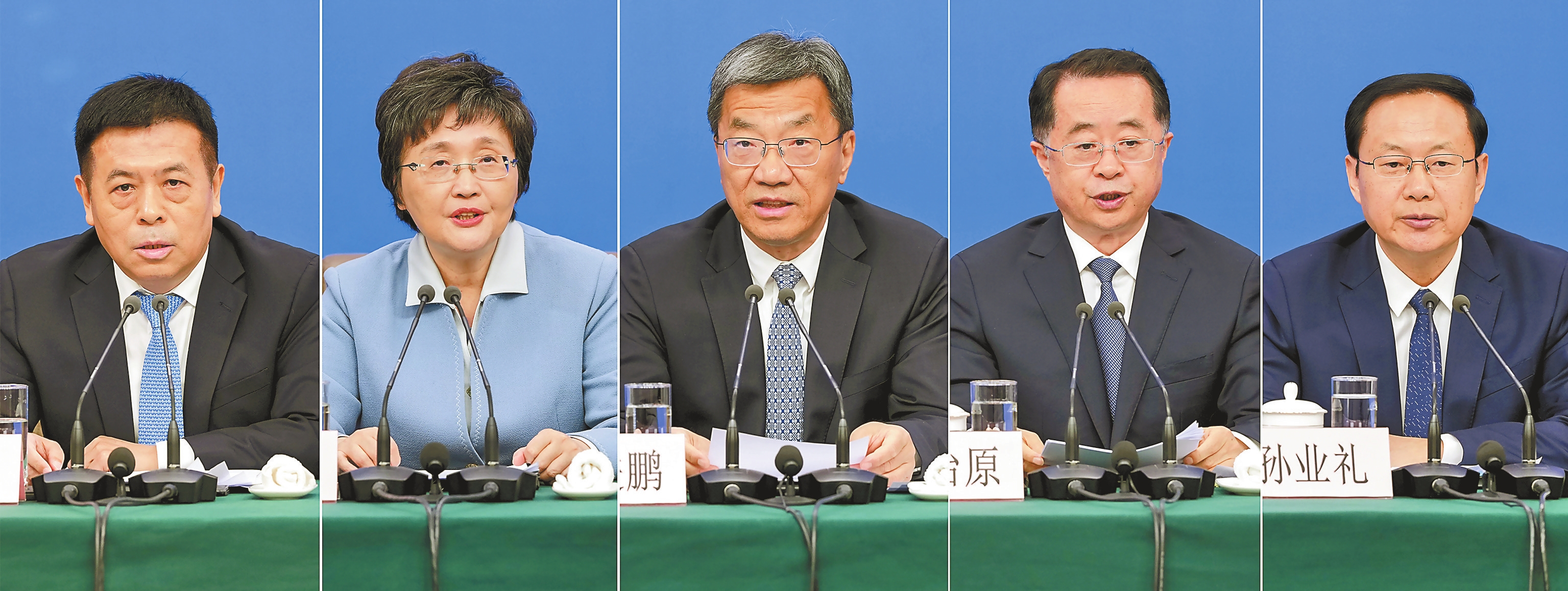 3月7日,十四届全国人大四次会议在北京梅地亚中心新闻发布厅举行记者会。教育部部长怀进鹏(中)、民政部部长陆治原(右二)、人力资源和社会保障部部长王晓萍(左二)、文化和旅游部部长孙业礼(右一)、国家卫生健康委员会主任雷海潮(左一)就教育、民政、人力资源和社会保障、文旅、卫生健康等相关问题回答中外记者提问(拼版照片)。新华社记者 王曦 摄