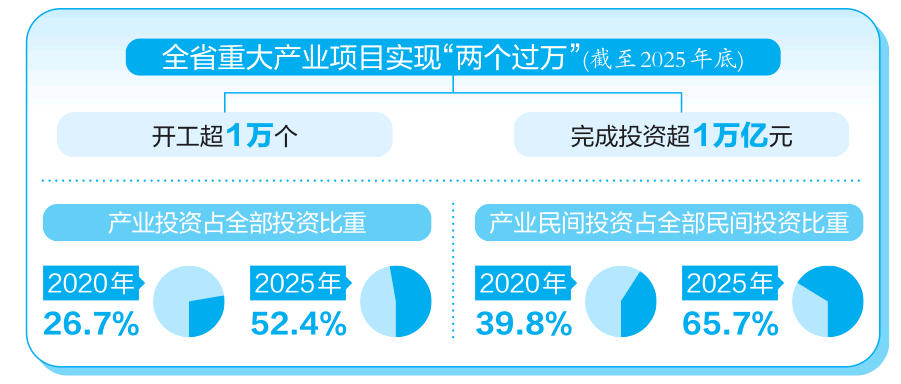 投资增长方式由主要依靠基础设施、房地产投资拉动向产业投资驱动转变。截至2025年底,我省重大产业项目实现开工超1万个、完成投资超1万亿元“两个过万”的重大突破,竣工投产项目近7500个,投产项目新增年产值超5000亿元、年税收190亿元,提供就业岗位超47万个。全省产业投资占全部投资的比重从2020年的26.7%提升至52.4%,成为拉动投资增长的主要力量。