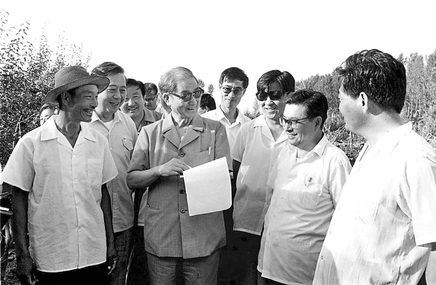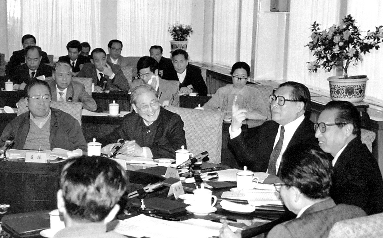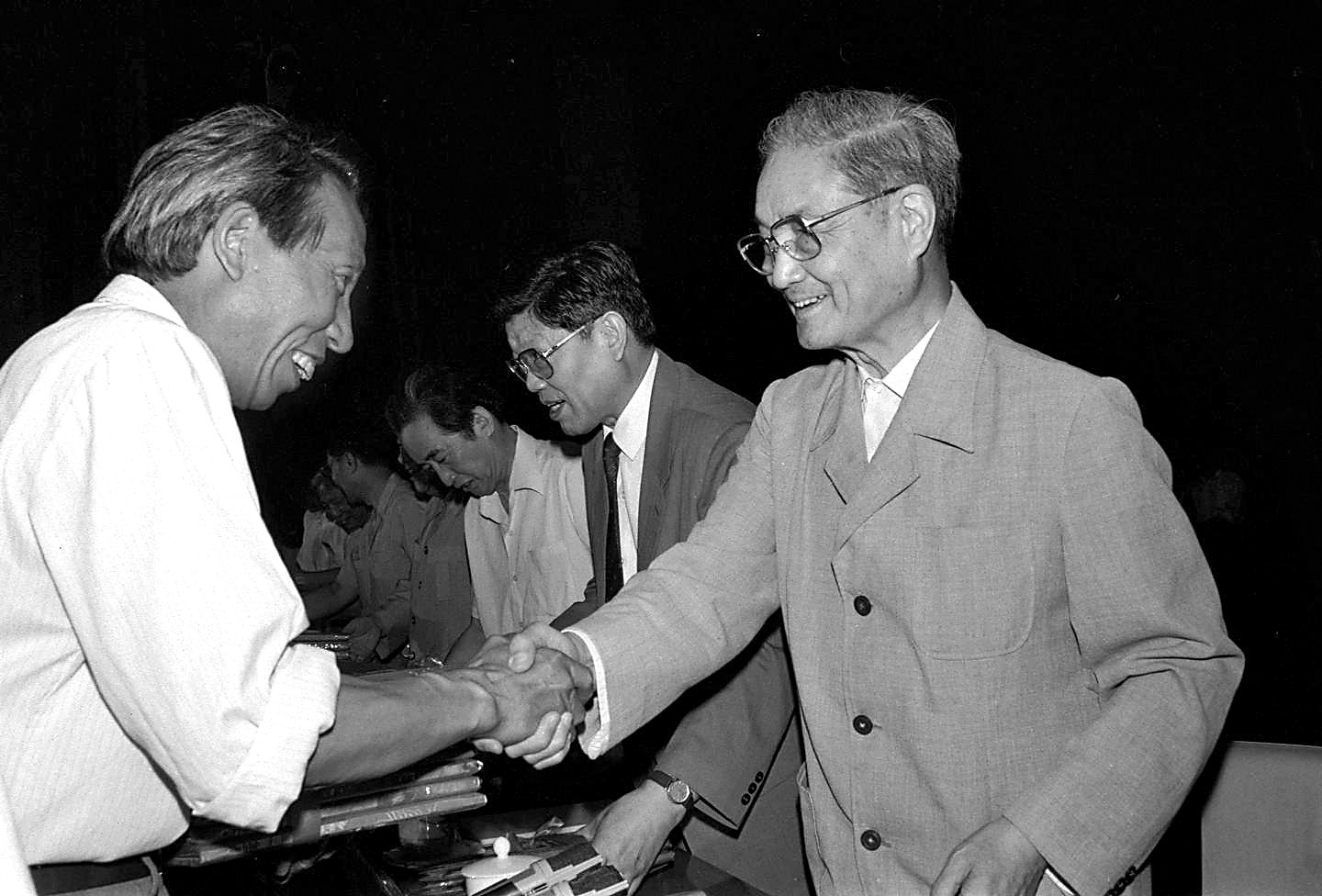1991年6月26日,中共中央组织部、中共中央宣传部等单位在北京召开大会,表彰全国高校优秀思想政治工作者。这是宋平同志(右)向获奖的个人颁奖。 新华社记者 张燕辉 摄