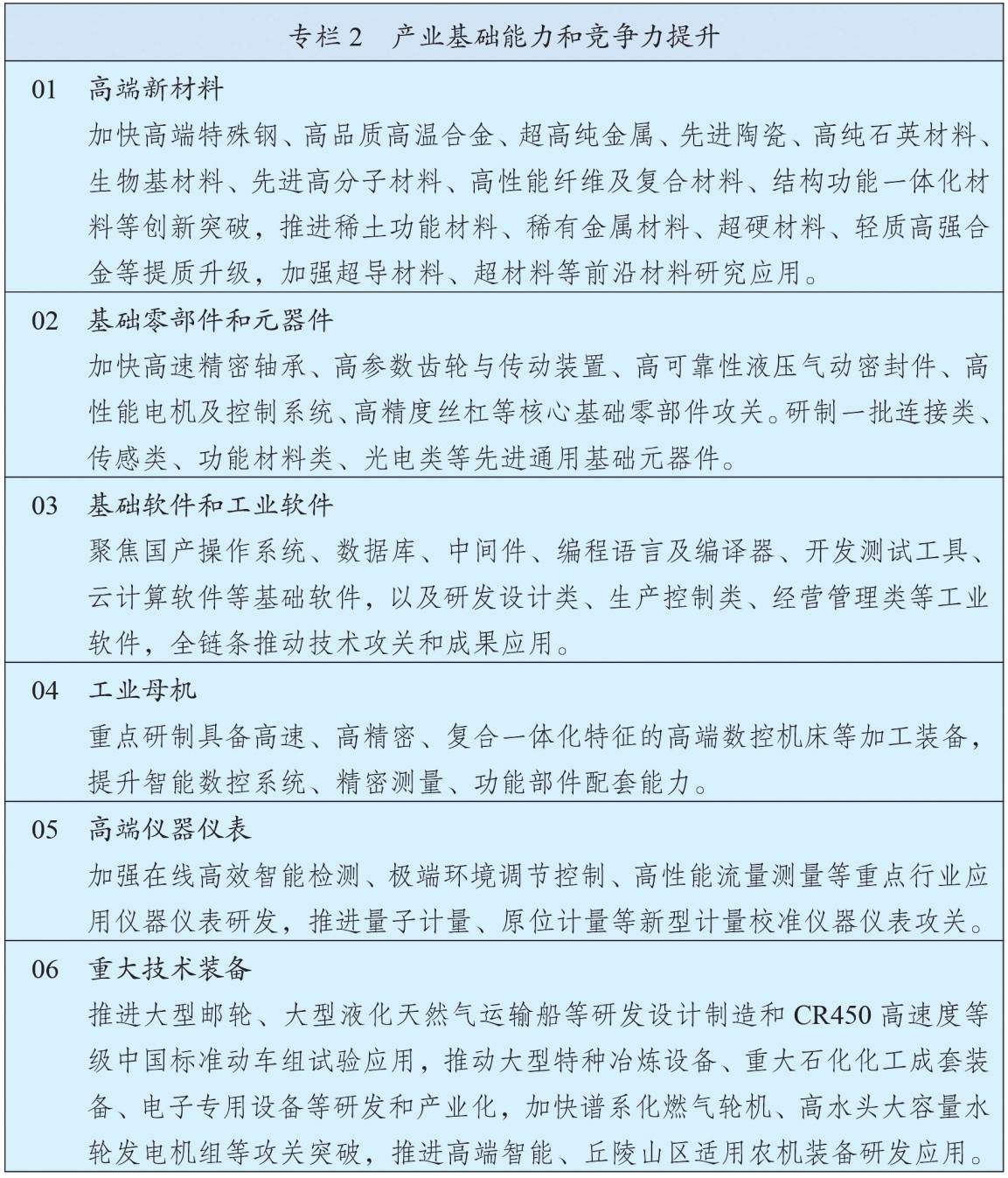 实施产业基础再造工程,加快突破一批重大基础技术、工艺和产品,推进先进材料、跨尺度制造等创新应用。实施重大技术装备攻关工程,突破一批标志性重大技术装备。滚动实施制造业重点产业链高质量发展行动,建立健全产业链供应链安全风险评估和应对机制,持续增强稀土、稀有金属、超硬材料等竞争优势,加强重要战略性矿产高质高效综合利用。推进国家战略腹地建设和关键产业备份,建设战略性产业基地、物资储备基地和基础设施。建立产业基础竞争力调查制度,强化共性技术研发支撑能力。完善首台(套)、首批次、首版次应用政策。
