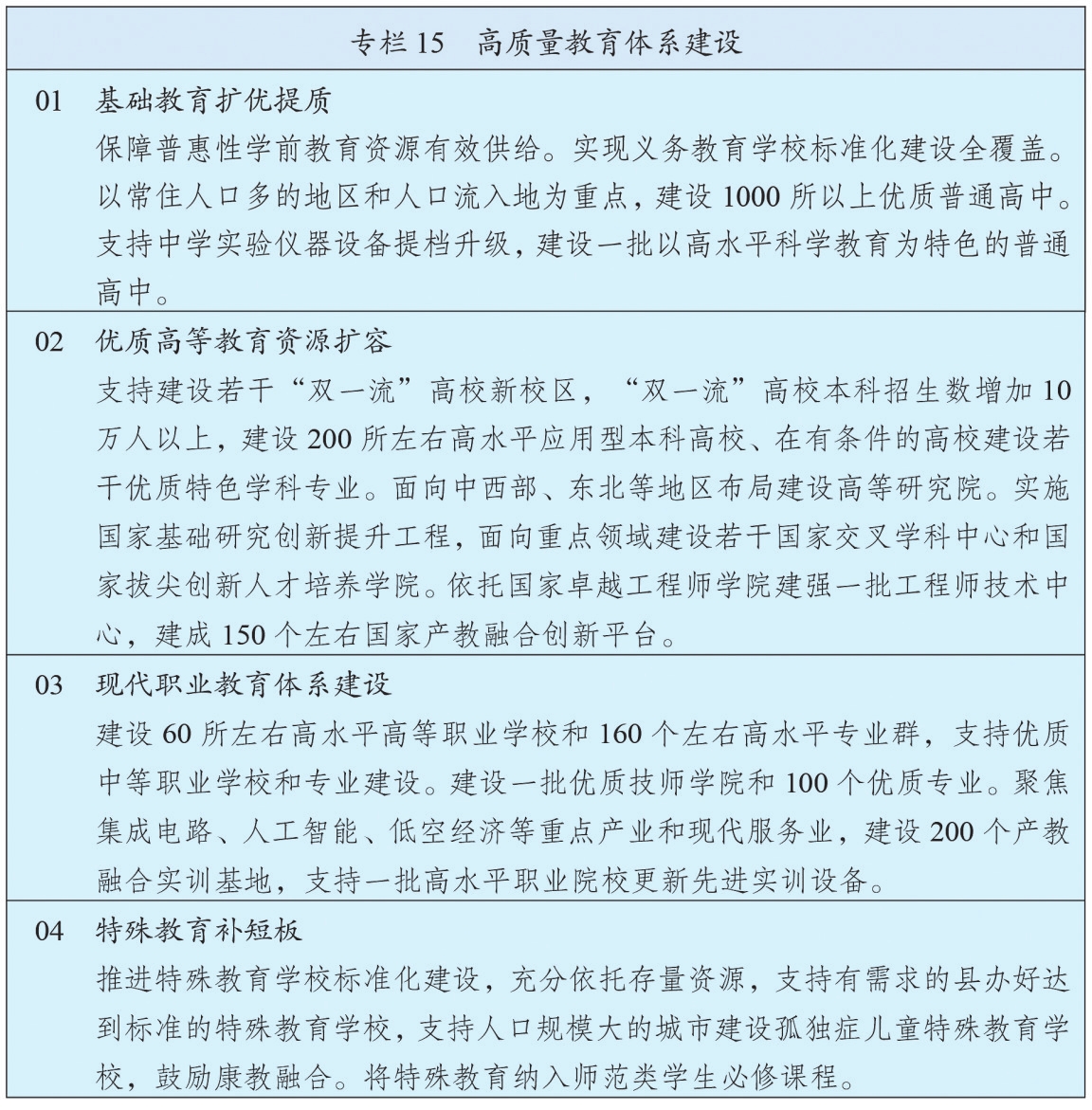 推进现代职业教育体系建设,提高职业教育办学质量和吸引力。优化与区域发展相协调、与产业布局相衔接的职业教育布局,推动专业设置紧密对接产业链创新链需求。深化中等职业教育改革,办好少而精的中等职业学校,建设特色鲜明高等职业学校,支持中高职一体化发展。建设一批高水平本科层次职业学校,推动职业教育本科与专业学位教育融合贯通。实行产教融合的人才培养模式,健全德技并修、工学结合育人机制,鼓励行业龙头企业举办或参与举办职业学校。