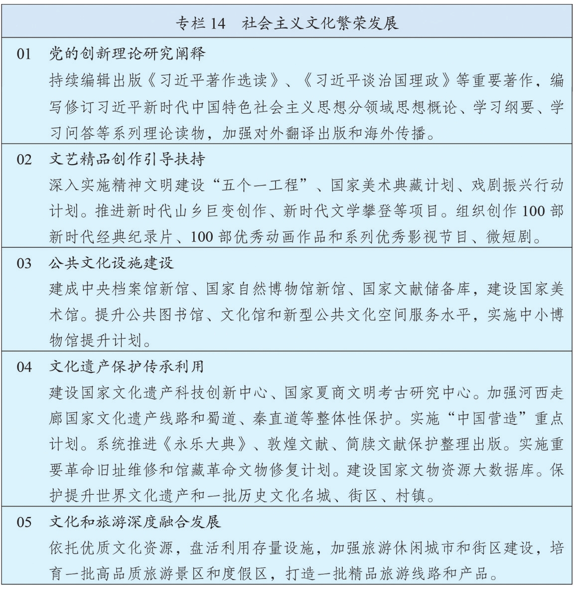 推动文化遗产系统性保护和统一监管,推进管理资源整合,建立文化遗产保护督察制度。深入实施中华优秀传统文化传承发展工程,构建中华文明标识体系。实施中华文明探源和考古中国工程。加大世界文化遗产、古迹遗址、革命文物、馆藏文物、文化景观等保护力度,加强历史文化名城、街区、村镇有效保护和活态传承。建好用好长城、大运河、长征、黄河、长江国家文化公园,优化建设管理体制机制。强化档案文献遗产保护和古籍抢救性保护,加强中华典籍文献传承。提升非物质文化遗产保护传承水平,培育传承体验新场景。加强和改进地方志工作。