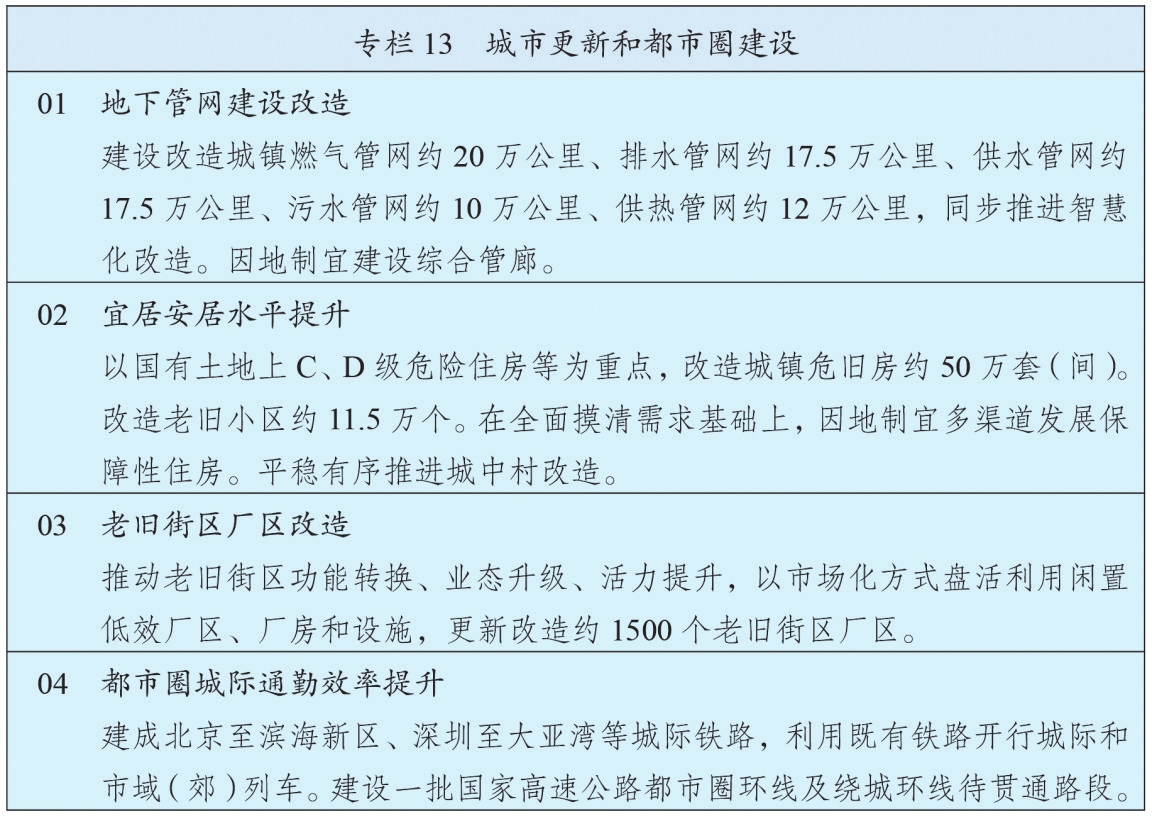 推动城市发展方式转变,建设创新、宜居、美丽、韧性、文明、智慧的现代化人民城市。实施激发产业创新活力专项行动,提升城市产业创新策源力。高质量推进城市更新,开展城市体检,加快建设完整社区,健全城市更新实施机制,建立与建筑功能转换和混合利用需求相适应的规划调整机制,构建可持续的城市建设运营投融资体系。高效利用城市地下空间。推动城市发展绿色低碳转型,优化城市公共交通服务,健全城市公园、绿道网络和慢行交通系统,不断完善15分钟健身圈。加快城市基础设施生命线安全工程建设,推进老旧管网和危旧房改造,提升城市排水防涝能力。严格限制超高层建筑,提升高层建筑火灾防范和救援能力。加强城市风貌和建筑设计管理,推动城市建筑更好体现中华美学和时代风尚。加强互嵌式社区建设。推进城市全域数字化转型,完善城市管理机制和运行管理服务平台,推动城市治理智慧化精细化。