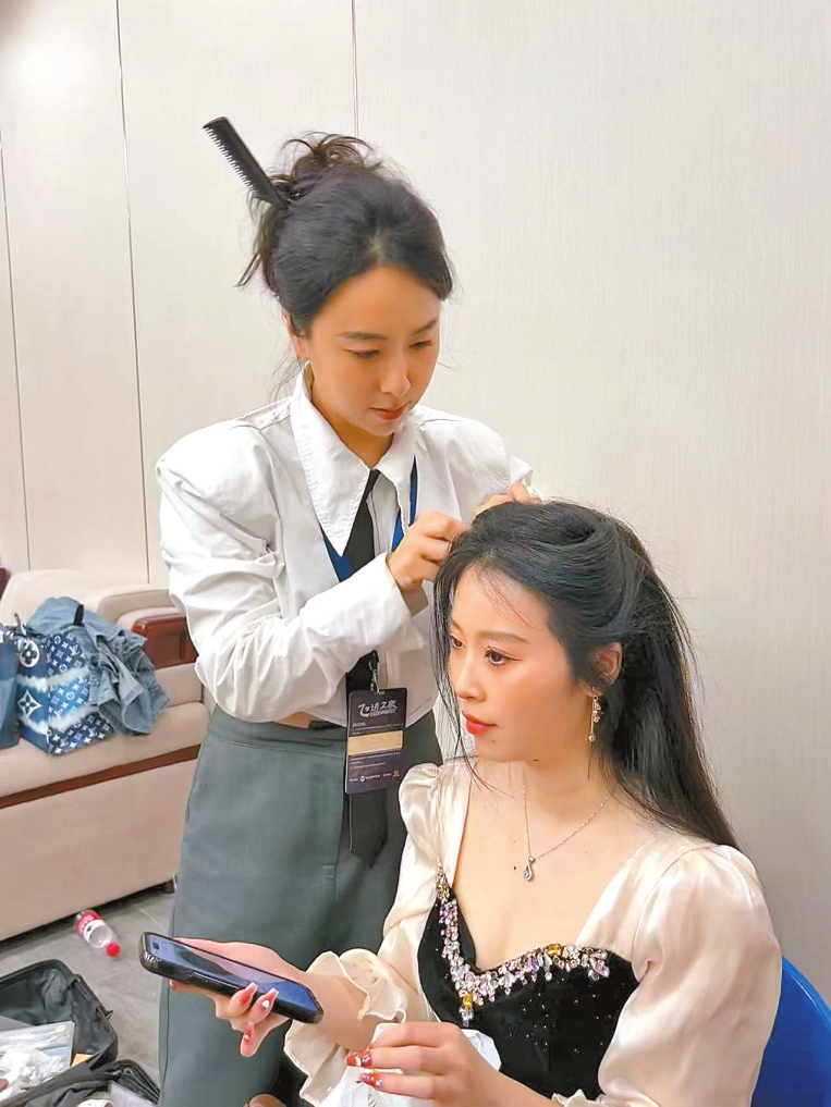 “婚礼跟妆考验的不仅有化妆的技术,还有与人打交道的能力。”王艺涵说。一场婚礼的跟妆服务,时长往往超过11个小时。清晨6时,天刚蒙蒙亮,她便拉着沉重的化妆箱奔赴婚礼现场。一天之中,她要根据新娘多套不同的服装,变换搭配相应的妆发造型,在这期间,她会使用3到4台摄影设备记录妆造全程。作为婚礼当天与新娘相处最久的人,她更像是新娘的“全天候”管家——新娘紧张焦虑时,她是温柔的情绪疏导师,轻声安抚、耐心开导;婚礼现场,她细致地指导新娘的仪态动作,及时补妆、整理造型,事无巨细地守护着婚礼的每一个环节。