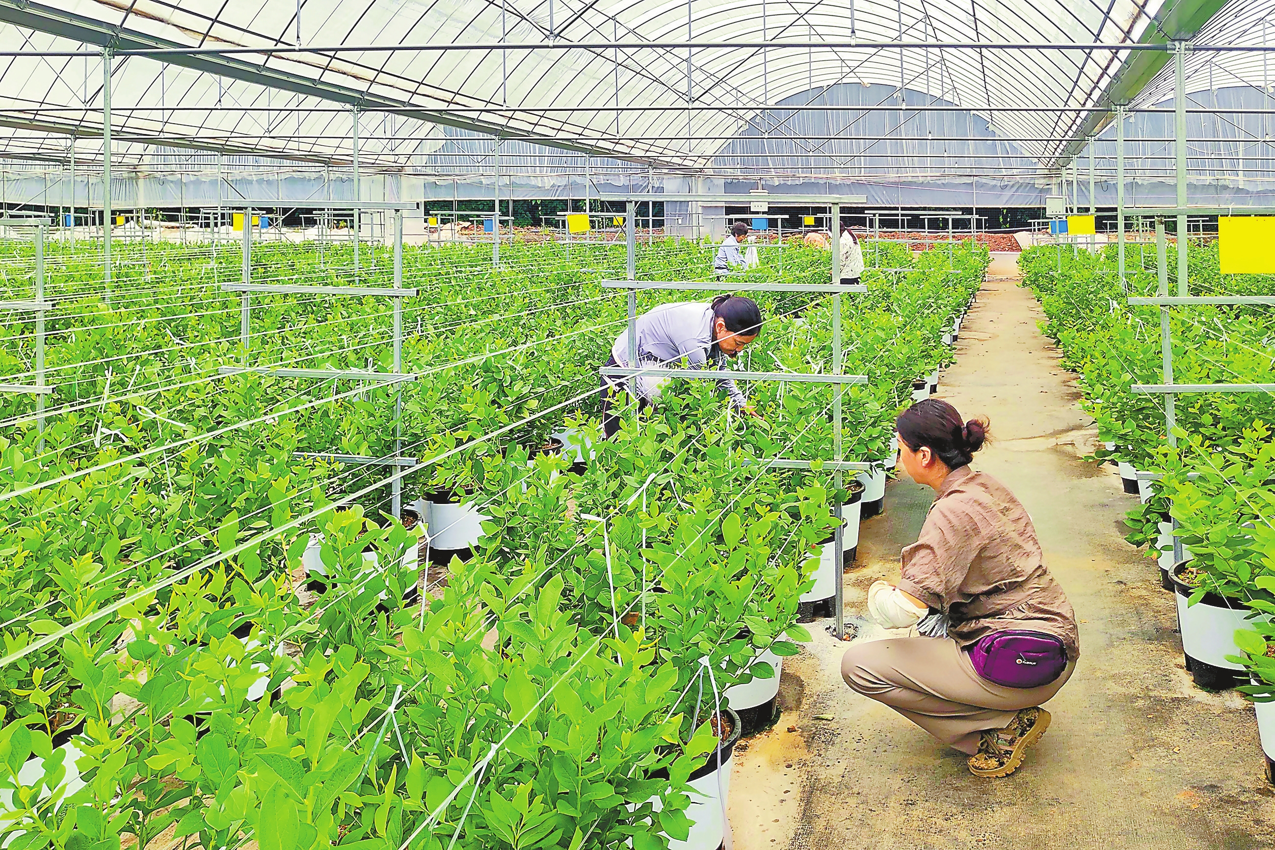 “我们的蓝莓有专用的基质配方、精准水肥管理,再加上全程的病虫害绿色防控,不仅节省土地,还能有效避免土传病害,实现绿色高效生产。”基地技术负责人李建一边查看水肥控制设备一边介绍,“蓝莓可以从1月采到6月,之后果农就开始修剪、养护,为来年挂果做准备,基本是半年采果、半年养树,土地和设施一年四季都不闲。按当前产量测算,这片40亩左右的基地,每年可产蓝莓50余吨,产值约200万元。”