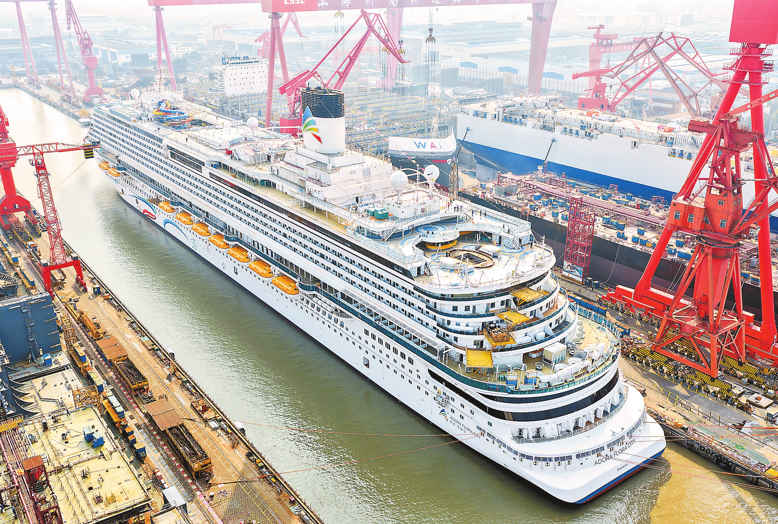 3月20日,第二艘国产大型邮轮“爱达·花城号”在上海出坞。这意味着该船的船体结构完整,已具备航行能力,全面转入码头调试阶段。“爱达·花城号”计划于今年底完成交付,将在广州南沙邮轮母港开启国际航线。图为3月19日拍摄的第二艘国产大型邮轮“爱达·花城号”。 新华社记者 丁汀 摄