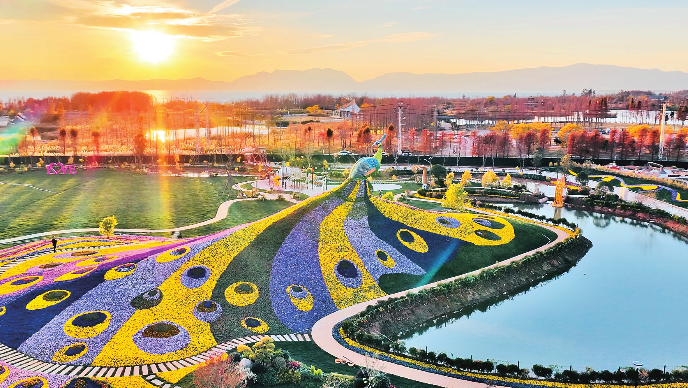 七彩花海公园巨型孔雀花雕由5万盆鲜花打造而成 本报记者 龙宇丹 摄
