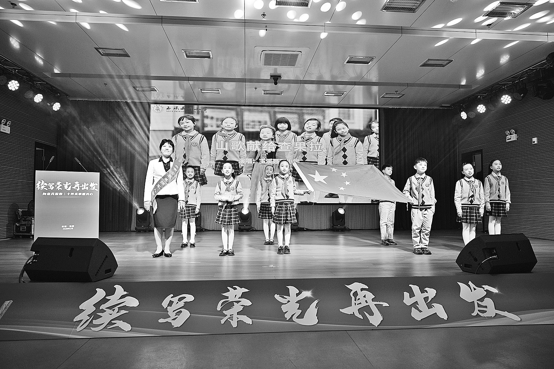 “鲜花送给解放军,山歌献给查果拉。”来自玉溪聂耳小学的孩子们现场献歌,他们手中的国旗曾经飘扬在海拔5318米的查果拉哨所上空,此刻将云南玉溪与西藏日喀则连在一起。3年前,一通来自查果拉哨所戍边战士的求助电话,最终让玉溪聂耳小学校长杨翠英抵达雪域高原。2025年1月,杨翠英带着师生的贺卡与信件来到哨所,战士们把这面曾经在此升起的国旗递送到她手上,来自查果拉的红色从此染红了云南玉溪的晴空。