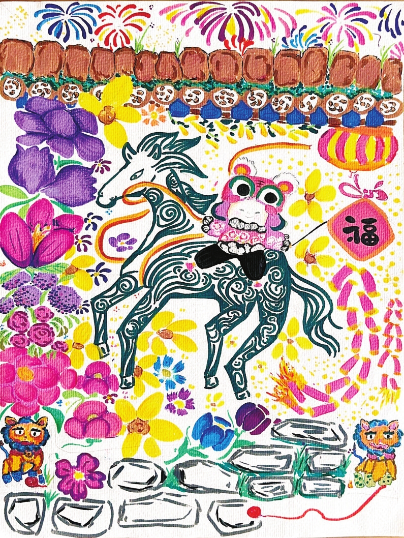 作品介绍:作品以奔腾的骏马为核心,寓意马年奔腾向前、顺遂如意。马上的娃娃头戴虎头帽,憨态可掬,举着福字送来吉祥,是对新春最鲜活的祝福。