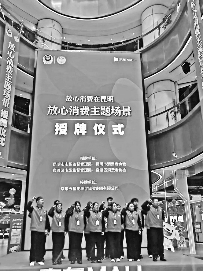 近日,昆明市市场监管局、昆明市消协在京东MALL商场举行授牌仪式,向京东五星电器(昆明)集团有限公司授予“放心消费主题场景”“线下无理由退货商场”“消费维权专委会”三块牌匾。