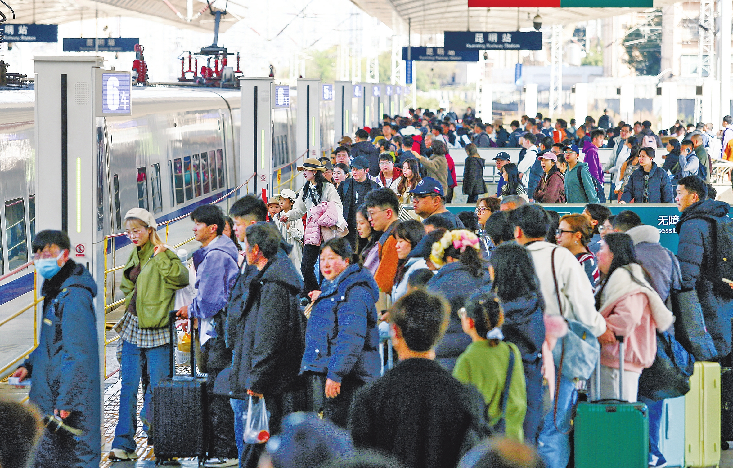 昆明南火车站,高铁静静停靠在晨光里。候车大厅一角,巡逻民警穿行在人流中,轻声提醒带小孩的旅客:“人多,把孩子看好,有事随时找我们。”检票口开启,人们缓缓向前,互相礼让,秩序井然。