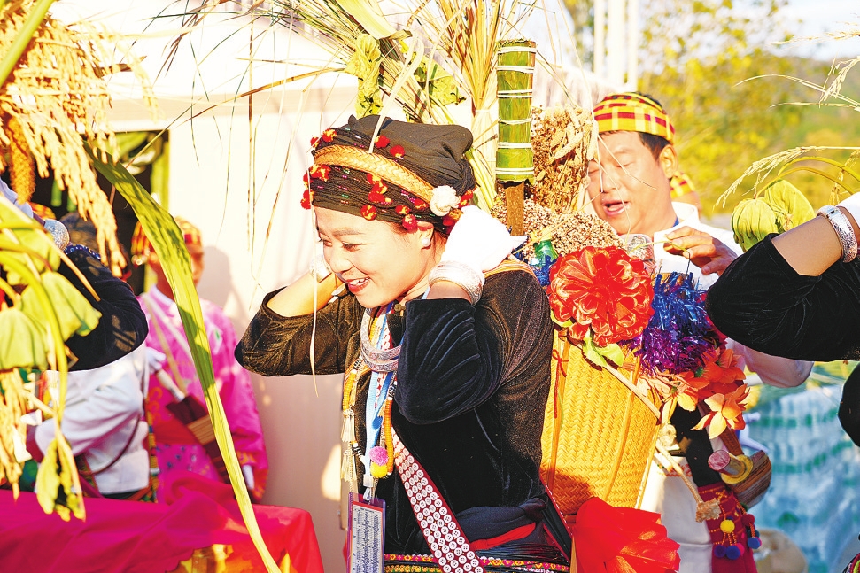 2月20日至21日,梁河县目瑙纵歌节在体育公园盛大开幕,吸引各地游客与各族群众共赴这场狂欢盛宴。图为祝贺团献上新春礼篮。 本报记者 马楠 通讯员 张芝廷 摄