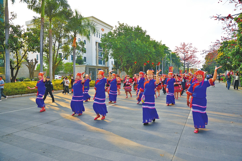 新春首日,元江街头人头攒动、喜气盈怀,由各民族表演方阵、鲜花水果方阵、各界代表方阵组成的巡游队伍穿行于城市主干道,用欢歌热舞串联起满城喜庆。图为傣族方阵巡游展示。 本报记者 李春丽 通讯员 王智贤 周馗 何磊 摄