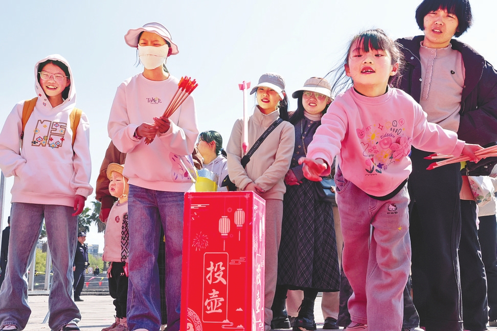 曲靖沾益区玉林广场人气爆棚,文艺演出、“四季村晚”、欢乐游园等系列活动接连上演。图为市民参与投壶活动。 沾益区融媒体中心供图
