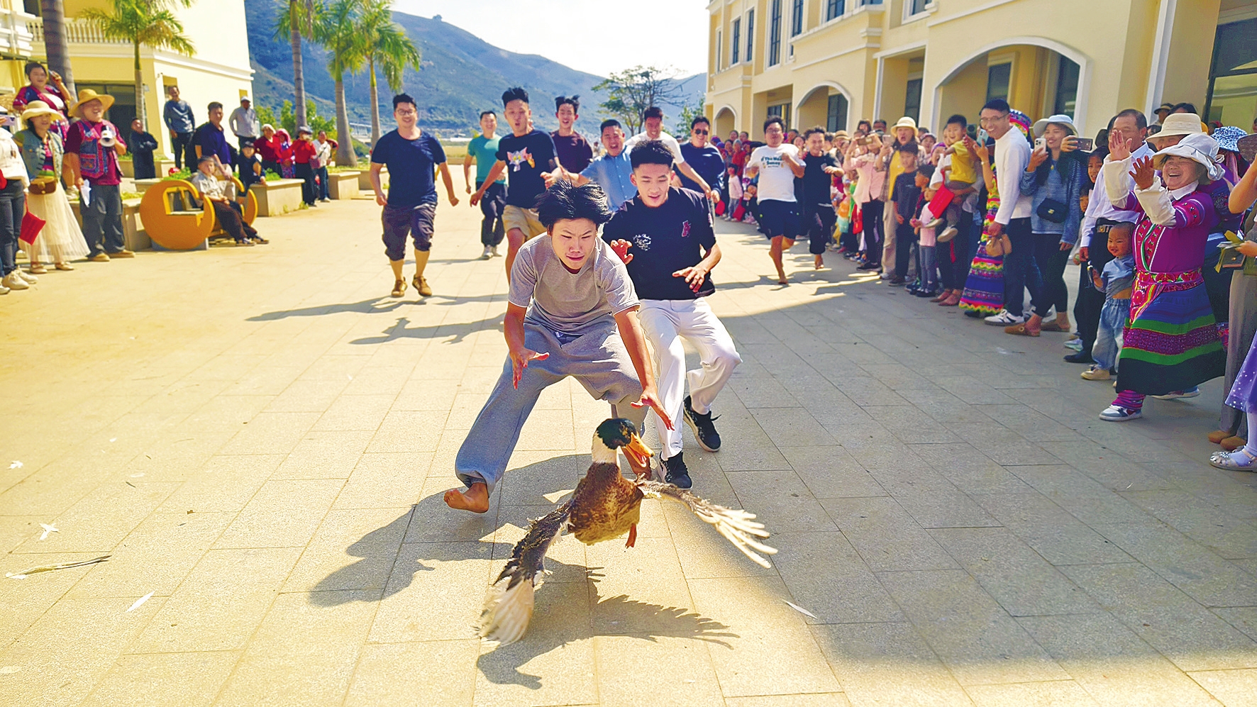 元江县甘庄集镇举办魅力侨乡文化节暨第十七届花山节。当地各族群众和八方游客体验了丰富多彩的民俗活动。图为抓鸭子比赛。 本报记者 李春丽 通讯员 白姝琦 方璐 万雨彤 摄