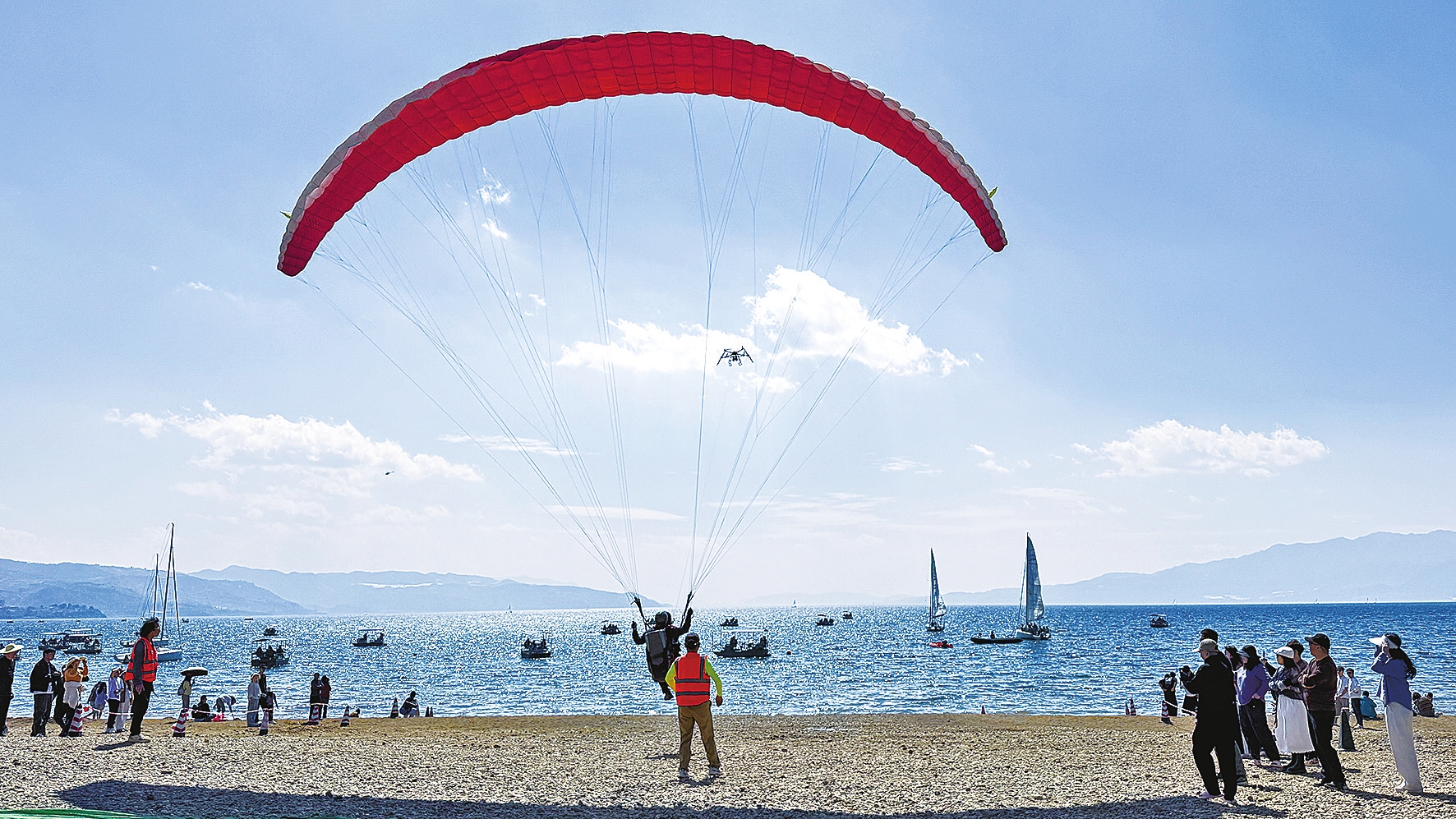 在抚仙湖月亮湾国际滑翔伞飞行营地,等候体验的游客排起了长队。在教练员协助下,游客穿戴好专业装备,随着无人机牵引绳缓缓加速,一跃而起,在300米左右的低空翱翔。从空中俯瞰,抚仙湖碧波万顷,月亮湾的金色沙滩与翠绿岸线交织成一幅绝美画卷。重庆游客秦海洋在体验后兴奋地说:“很美妙的一次体验,有着不一样的收获。”