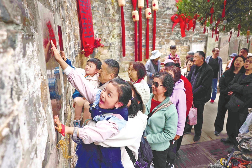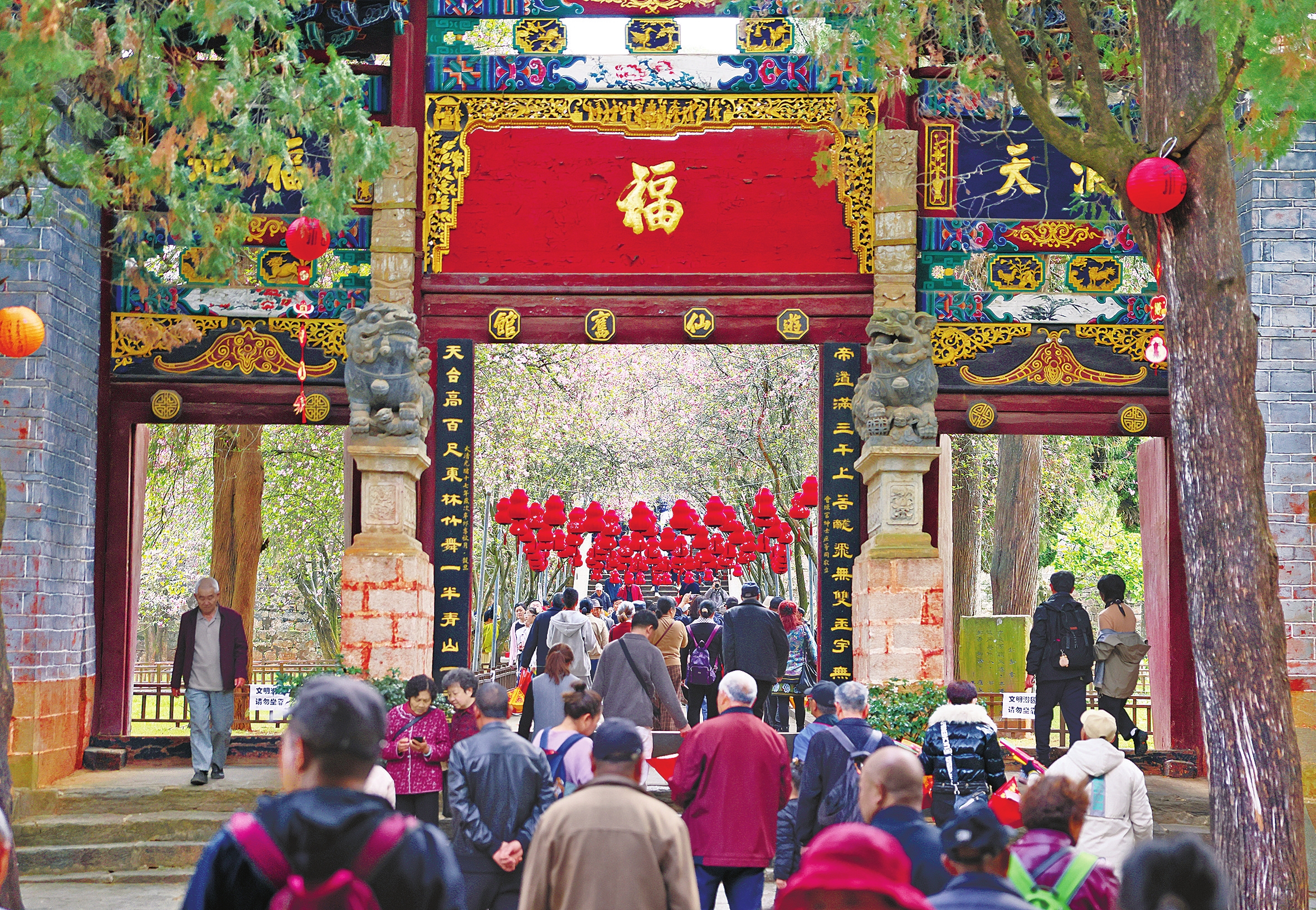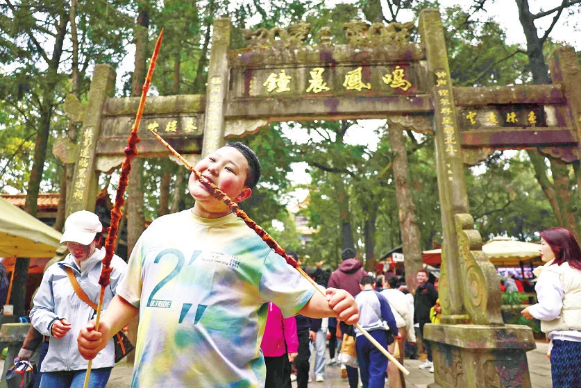 清晨的鸣凤山薄雾缭绕,金殿名胜区入口处已是人头攒动。沿着一天门、二天门、三天门的石阶向上,沿途张灯结彩,与盛放的山茶花相映成趣。从山脚到太和宫,一路上游人摩肩接踵,老人牵着孩子,家人结伴同行,每个人的脸上都洋溢着新春的喜悦。
