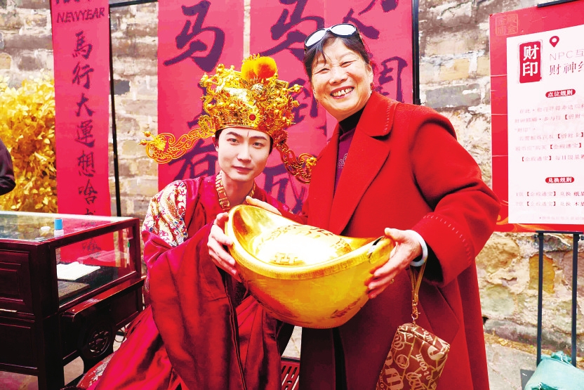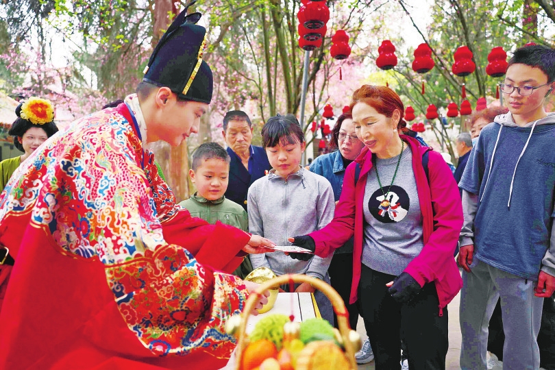 今年庙会推出的“神行甲马·乐赏山茶”古风游园打卡活动成为一大亮点。紫薇园的锦鲤仙子、秋园的陈圆圆、钟楼的山茶花神等NPC(非环境角色)与游客亲切互动,沉浸式体验让年轻游客流连忘返。600余亩的山茶园内,40余万株山茶花正值盛花期,逛完庙会的游客们漫步花间,在姹紫嫣红中拍照留念,尽享春日美好。