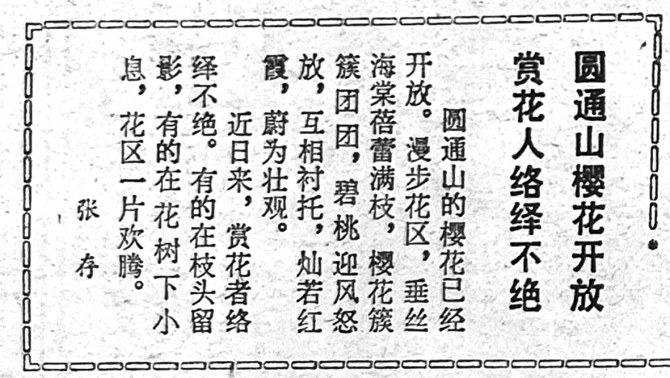 翻开1986年3月1日的《春城晚报》,一则关于圆通山樱花的报道,记录了那个年代的春日盛景。彼时的圆通山,樱花与海棠花交相辉映,零星分布的花树沿着步道舒展枝丫,粉白、粉红的花瓣随风轻舞,成为昆明人春日里最朴素的欢喜。没有复杂的玩法,没有精致的打卡,人们只是沉醉于花叶舒展的自然之美,赏完花便踏着春光离去。“看一眼花开”,便是那个年代最纯粹的游玩需求。