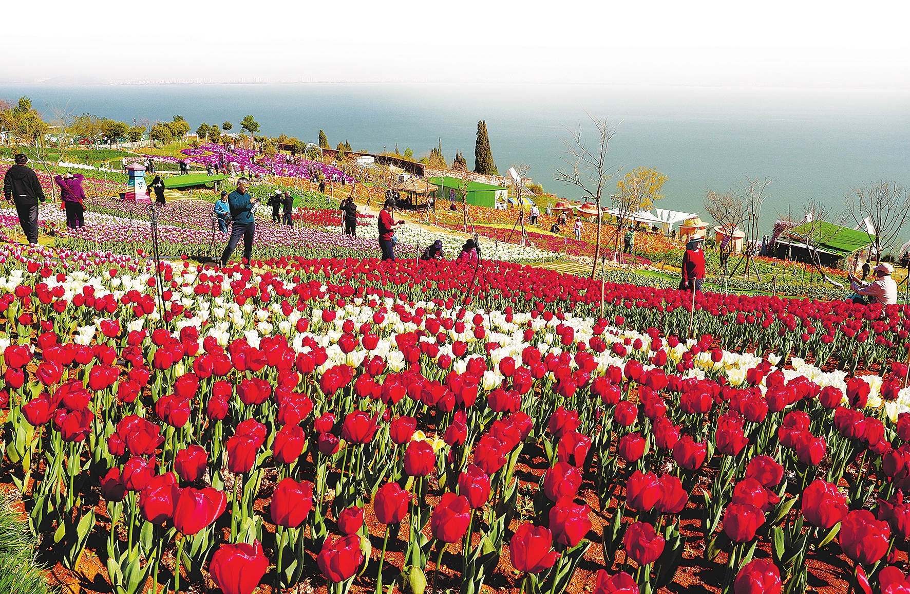 滇池之滨的捞渔河湿地公园,百万株进口郁金香正热烈盛放。记者了解到,今年园内种植了21个特色品种、逾100万株郁金香,铺展在20亩土地上,清雅的单瓣与娇艳的重瓣交织成片,在滇池水天一色的映衬下,绘出一幅清新浪漫的春日画卷。