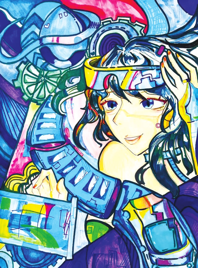 作品介绍:作品用明快饱和的色彩与充满动感的线条,塑造了一个沉浸在数字世界中的少女形象,将科技感与二次元美学相融合,传递出年轻一代在数字时代的精神状态。
