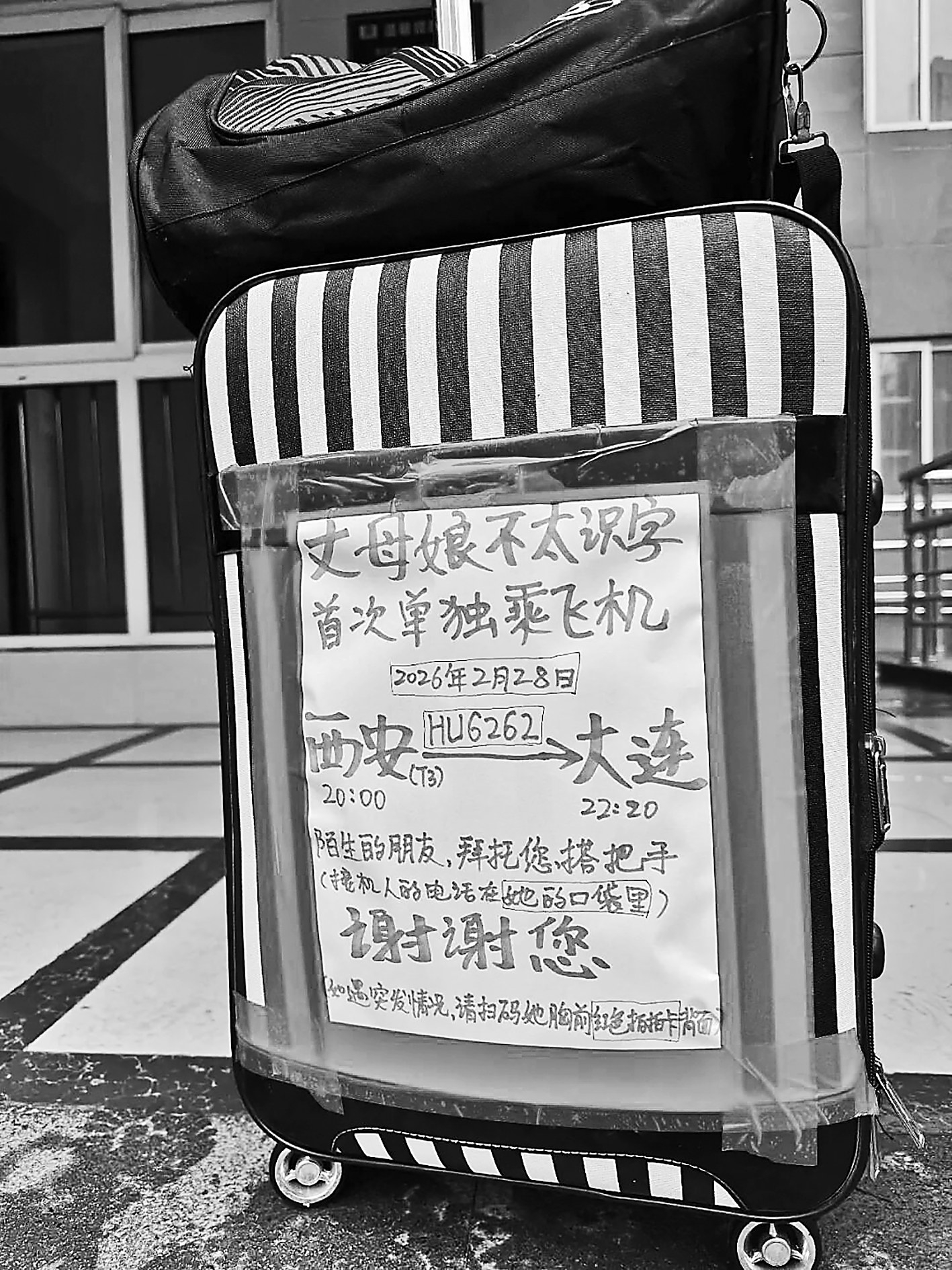 3月1日,视频发布者赵先生表示,此次是丈母娘第一次一个人乘机从西安去大连,他们也确实无法陪同,加上老人不太会讲普通话,会晕机、晕车,还带了行李,家人都有些担心。赵先生尝试把老人的航班信息写在A4纸上,并贴在行李箱一侧,还在社交平台发帖,看能不能找到同班次的乘客帮忙。