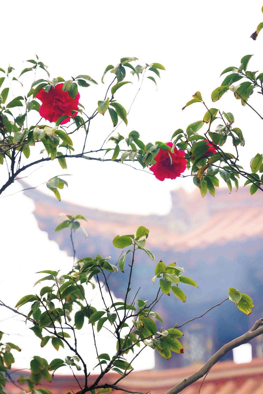 “鸣凤山茶”作为昆明十六景之一,春节前后是最佳观赏期。走进金殿名胜区,600余亩、40余万株茶花竞相吐艳,1200余个山茶品种构筑起西南地区最丰富的山茶资源宝库。这座始建于明万历三十年的“滇中第一名胜”,将太和宫古建筑群、铜铸金殿的历史厚重与茶花的灵秀相融。阳光掠过飞檐翘角,洒在层层叠叠的花瓣上,尽显“花映古建”的独特韵味。