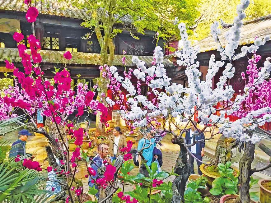 “此地文物盛,花桩百样殊。”桃桩作为通海传统盆景艺术的代表之一,以独特造型与艳丽花姿成为春日里一道亮丽景观。走进秀山公园玉皇阁,古朴典雅的古建筑与烂漫桃花相映成趣。一盆盆造型苍劲的桃桩错落有致、排布精巧,枯木逢春、花满枝头,宫粉、朱红、白碧桃、粉碧桃、牡丹桃、胭脂红6个品种的桃花次第吐蕊。