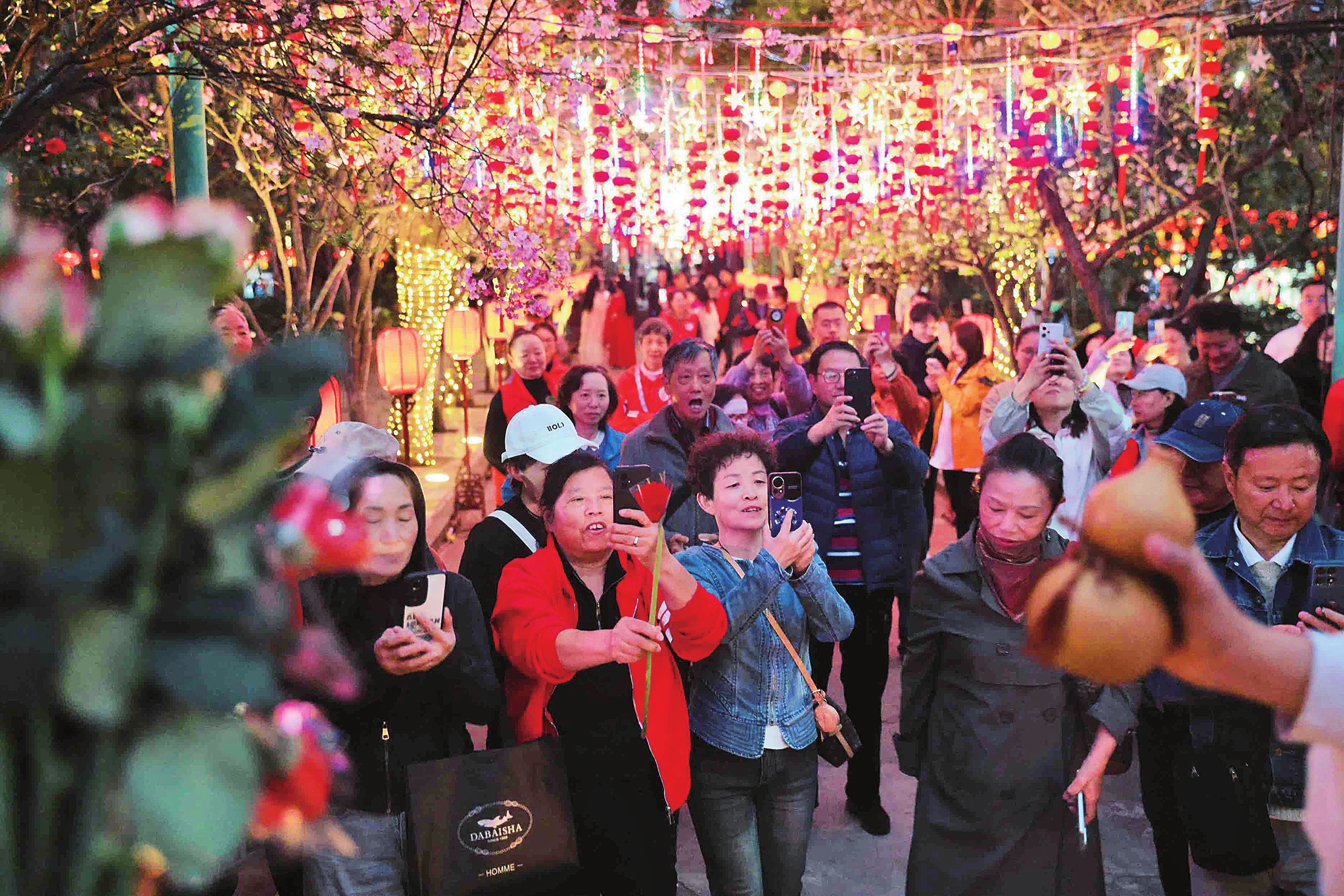 市民游客在昆明文庙驻足赏灯、看村晚。 本报记者 高吴双 摄