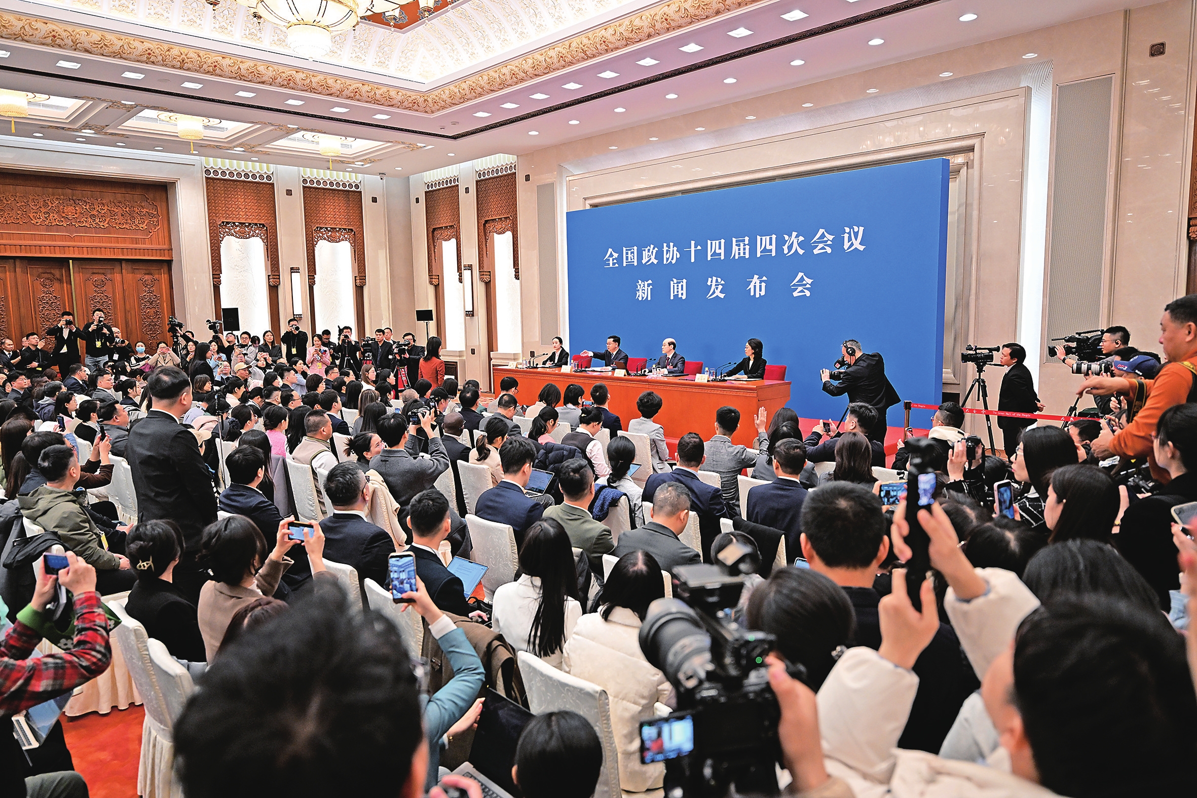 人民大会堂一层新闻发布厅,座无虚席。中外记者早早到达会场,用摄像机、相机、手机等设备,实时向世界各地播报发布会最新情况。