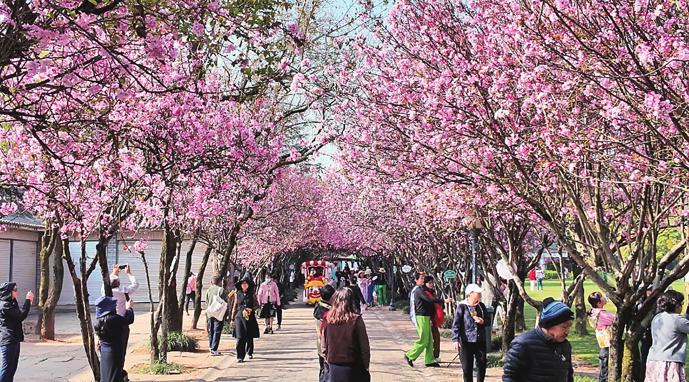 3月春深,花开正艳。昆明西华园内800米环形步道两侧的垂丝海棠迎来盛花期,粉白交织的花海如云似霞,吸引大批市民游客纷至沓来。