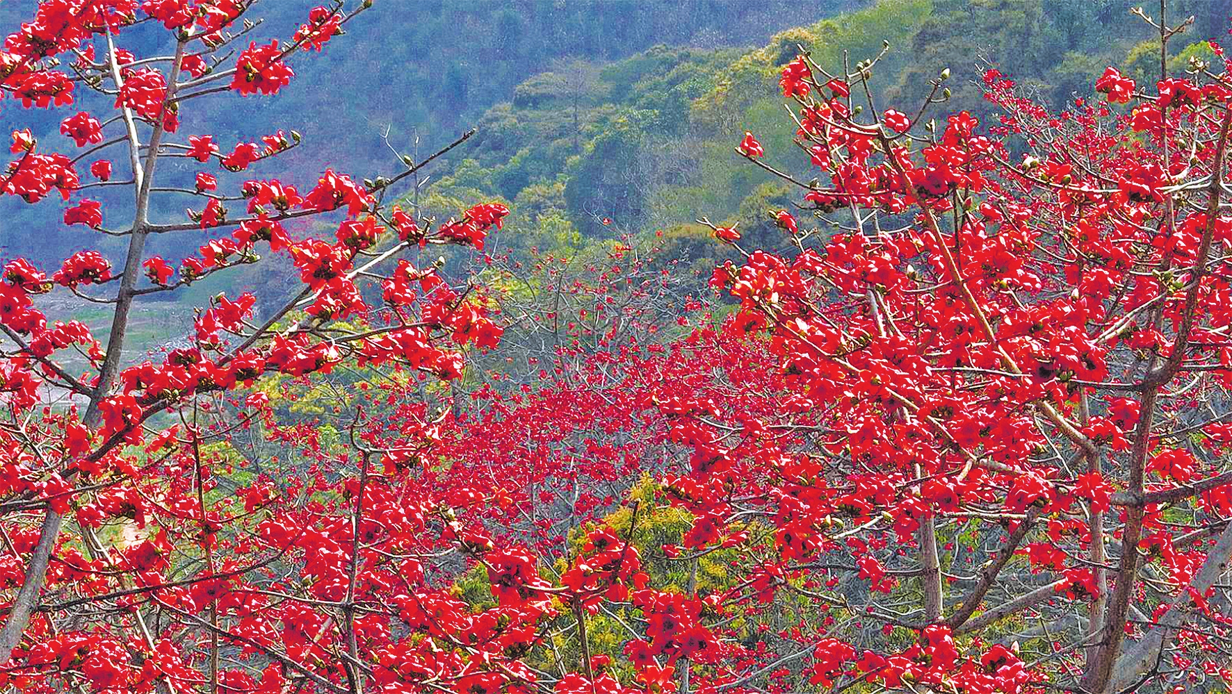 在漠沙、戛洒镇一带,攀枝花沿红河谷怒放,尤以漠沙集镇的曼线村阿迪村小组为核心观赏地。碗口大的花朵红似火,沿着河岸自然生长,午后的阳光下,花影摇曳生姿,满树火红与江水交相辉映,成为春日里最耀眼的景致。