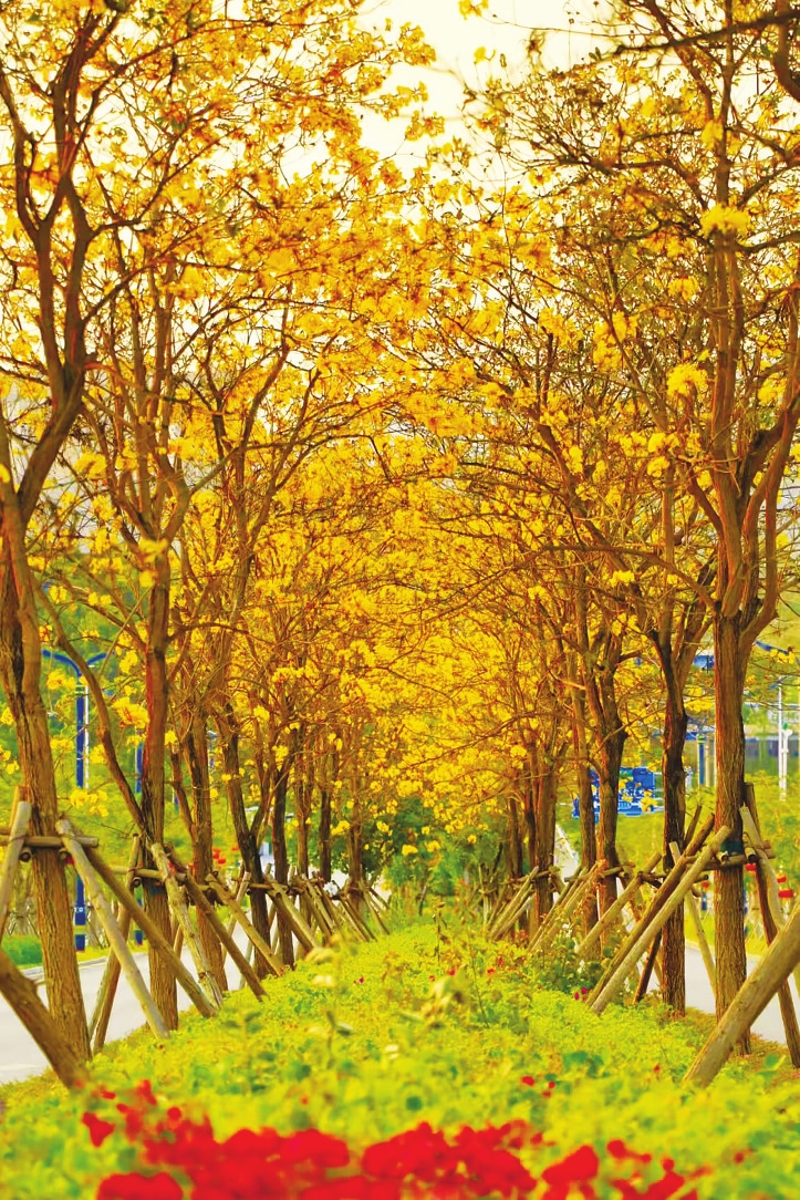 走在凤凰花大道上,仿佛步入了一幅徐徐展开的春日盛景图,沿线绽放的黄花风铃木如金色的瀑布般倾泻。抬眼望去,一簇簇精致的小花密密匝匝缀满枝条,沿着道路蜿蜒舒展,宛如一条金色花带,吸引了众多市民和游客前来拍照打卡。