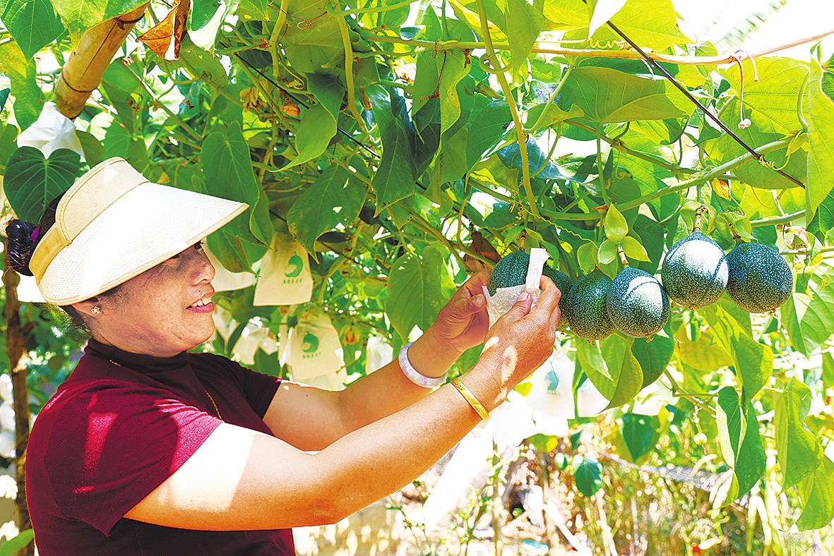 “你看这果子长得多好!按目前市场价每公斤40元算,我这150株热情果,亩产值保守估计在5000元以上。”段开菊一边给果子套袋,一边笑着算着增收账,“套袋既能防病虫害,还能保证果子品相,卖价也能更高。”丰收的喜悦,真切地洋溢在她的眉梢眼角。