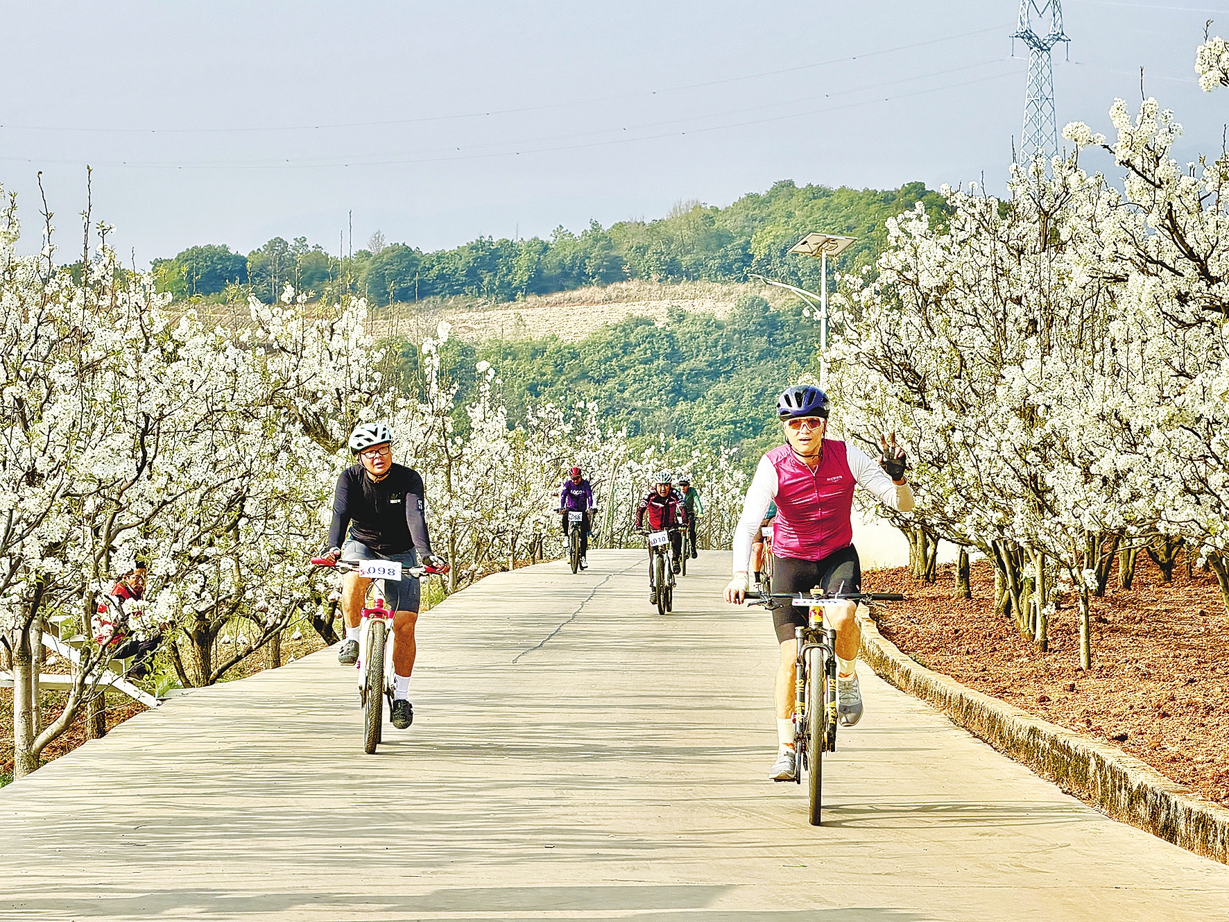 上午9时许,自行车赛率先鸣枪,正式拉开本届梨花节的帷幕。骑手们穿梭于花海与青山绿野间,迎风竞速、奋勇争先,游客们漫步花间、驻足打卡,竞速活力与田园诗意相互交融,气氛热烈。