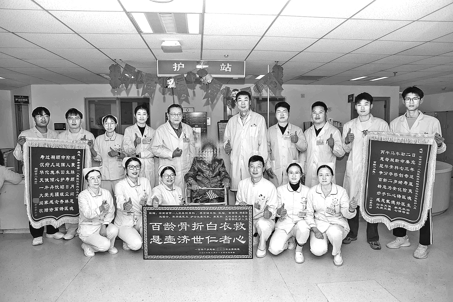 2026年3月3日,一位意外跌倒后接受紧急手术的101岁高龄老人,在云南省第一人民医院(以下简称“省一院”)骨科医护团队的精心救治与悉心照护下顺利康复出院。家属满怀感激之情,专程给科室送上两面锦旗、一块牌匾及一封感谢信,以此向医护人员致以最诚挚的谢意。