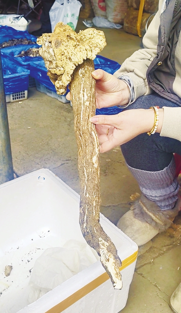 “这朵鸡枞全长50厘米左右,肉质非常紧实。”云南木水花野生菌交易中心商户陶子介绍,这朵鸡枞是在曲靖一个果园中被发现的,挖出后第一时间就被送到了市场,叫价2600元,引来不少顾客前来围观。“可能是因为缺水,导致菌帽长得有点丑,但不影响它的鲜甜口感,非常适合炖鸡汤。”