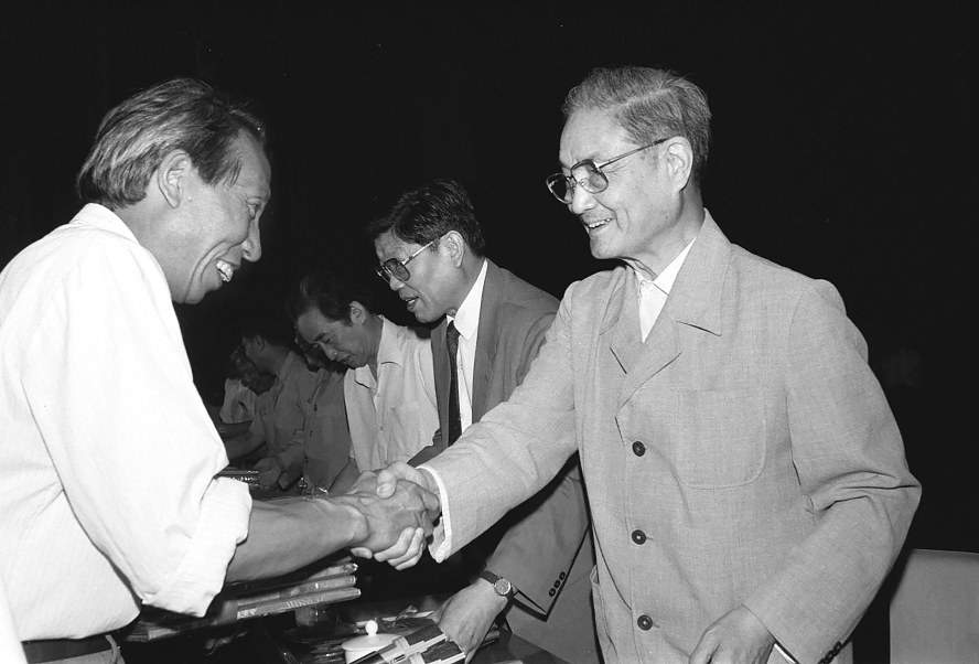 1991年6月26日,中共中央组织部、中共中央宣传部等单位在北京召开大会,表彰全国高校优秀思想政治工作者。这是宋平同志(右)向获奖的个人颁奖。新华社记者 张燕辉 摄