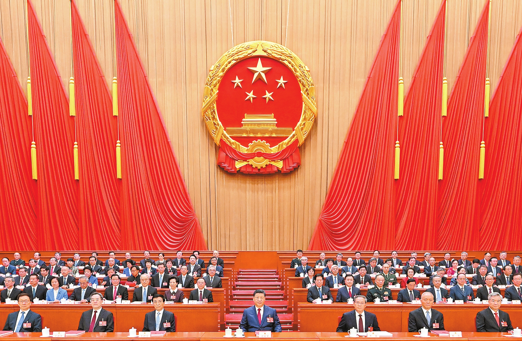 3月12日下午,第十四届全国人民代表大会第四次会议在北京人民大会堂闭幕。党和国家领导人习近平、李强、王沪宁、蔡奇、丁薛祥、李希、韩正等在主席台就座。 新华社记者 谢环驰 摄