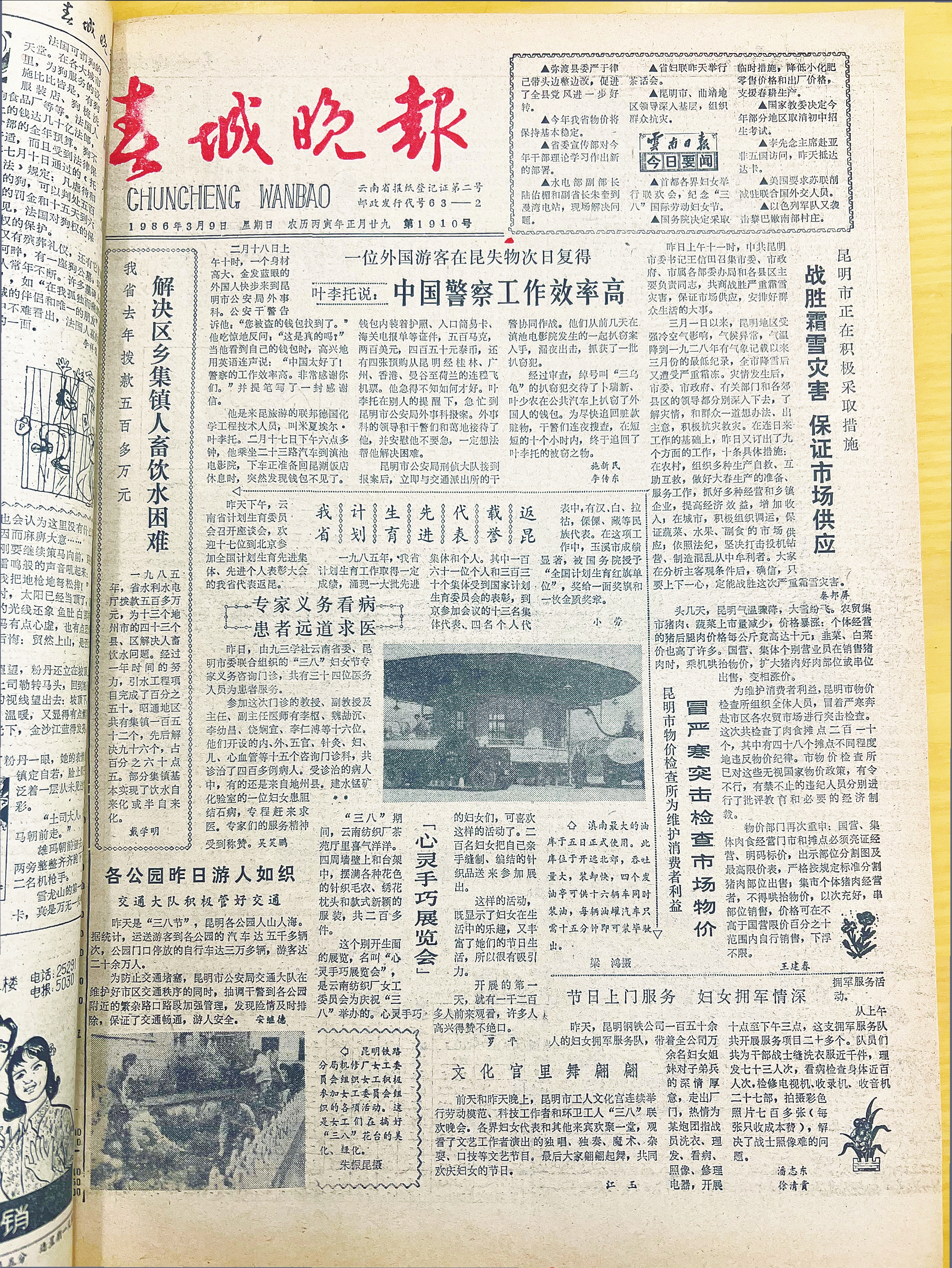 翻开1986年3月9日的《春城晚报》,在报纸最下方看到这样一则消息——“前天和昨天晚上,昆明市工人文化宫连续举行劳动模范、科技工作者和环卫工人‘三八’联欢活动。各界妇女代表和其他来宾欢聚一堂,观看独唱、独奏、魔术、杂耍、口技等文艺节目,最后大家翩翩起舞,共同欢庆妇女的节日。”