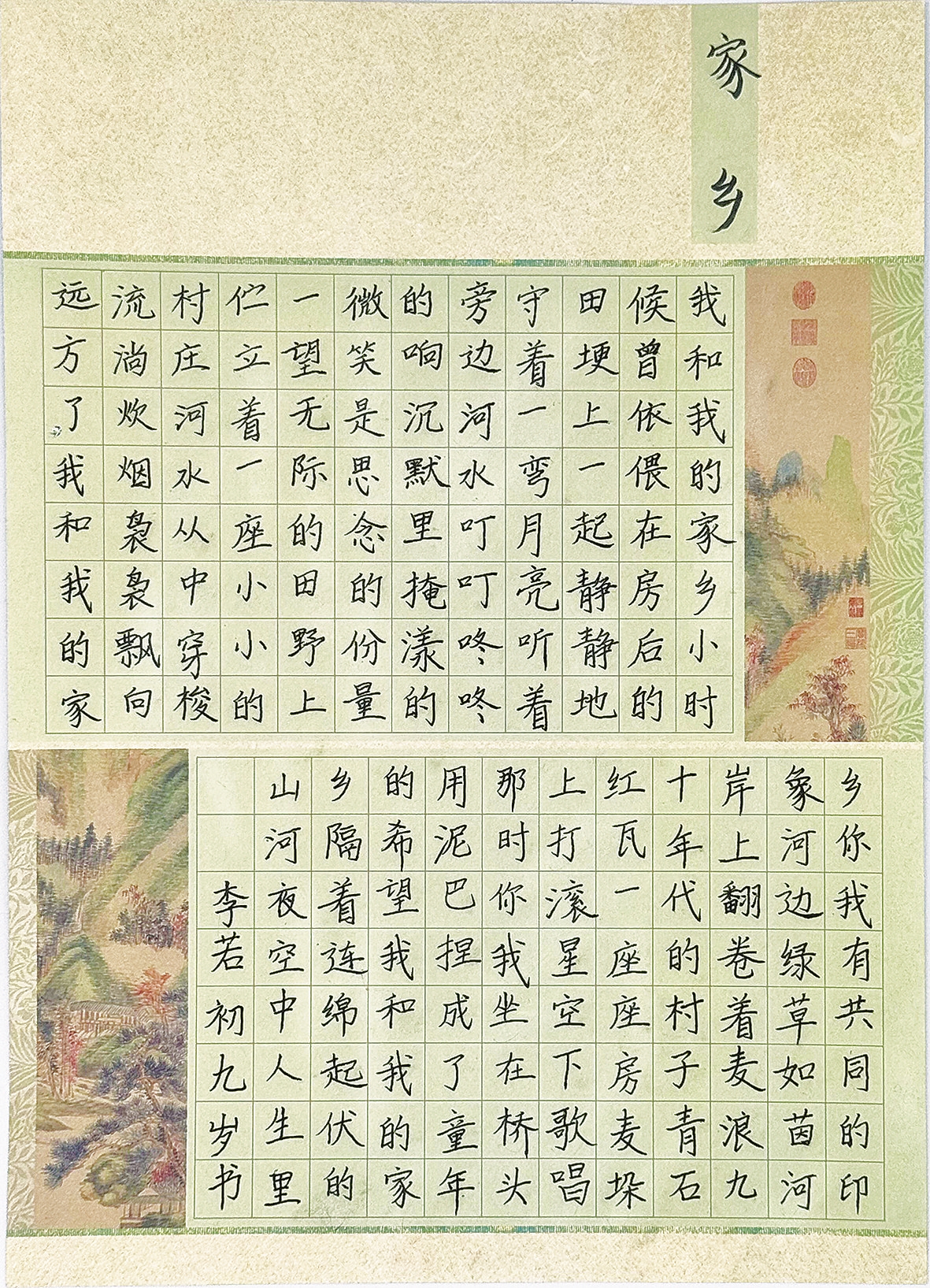作品介绍:这是一篇原创散文书法作品,整体风格清新细腻,充满了对故乡的眷恋与怀念。