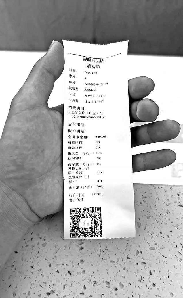 普先生口中的涉事门店为永琪美容美发,在昆明经营多年,曾被宣传为“行业标杆”,积累了大量忠实顾客。为了方便家人日常消费,普先生趁着门店推出“充多折多”优惠活动,一次性充值2万元。门店突然关停时,卡内仍有8000多元余额尚未使用。